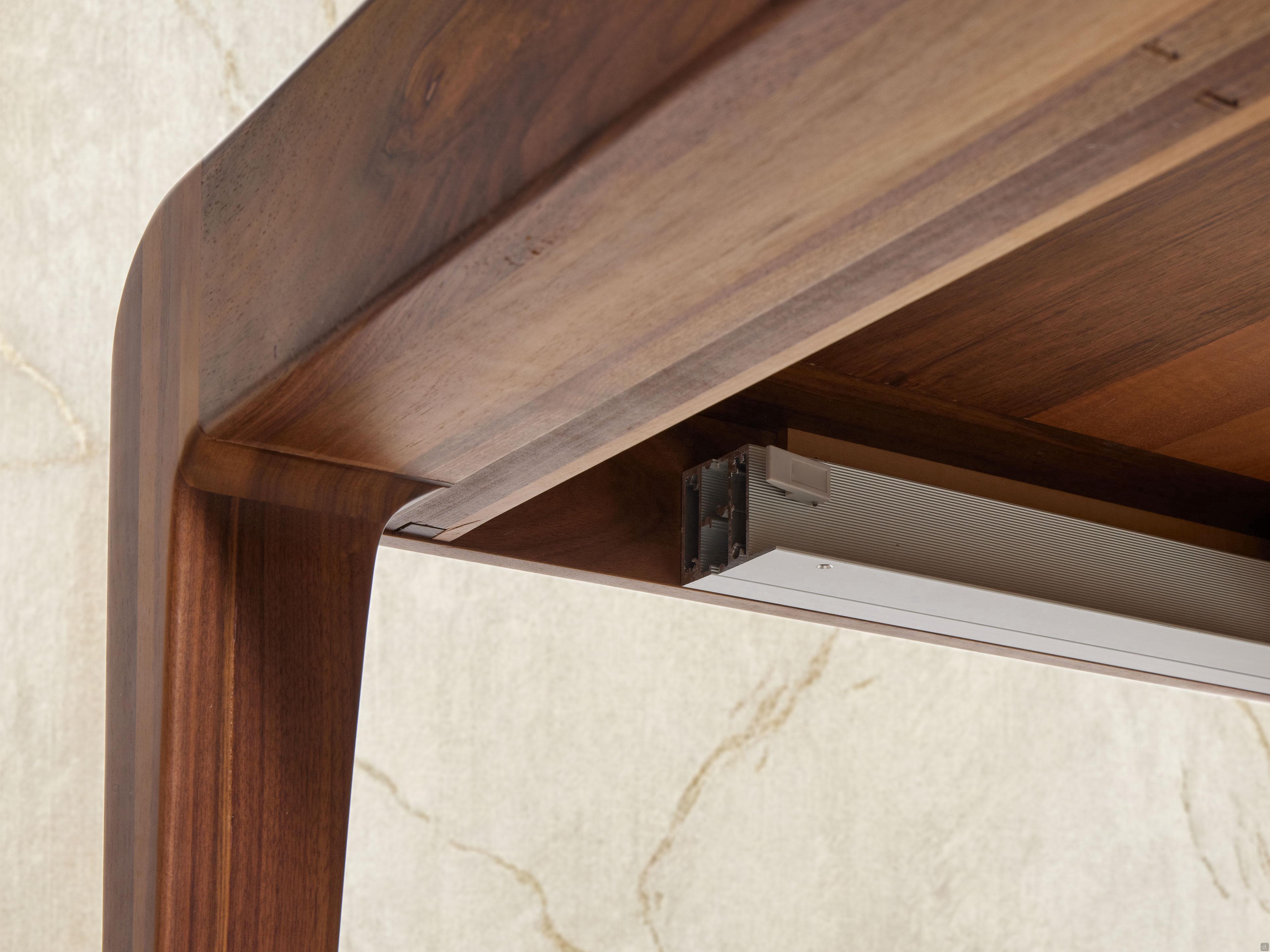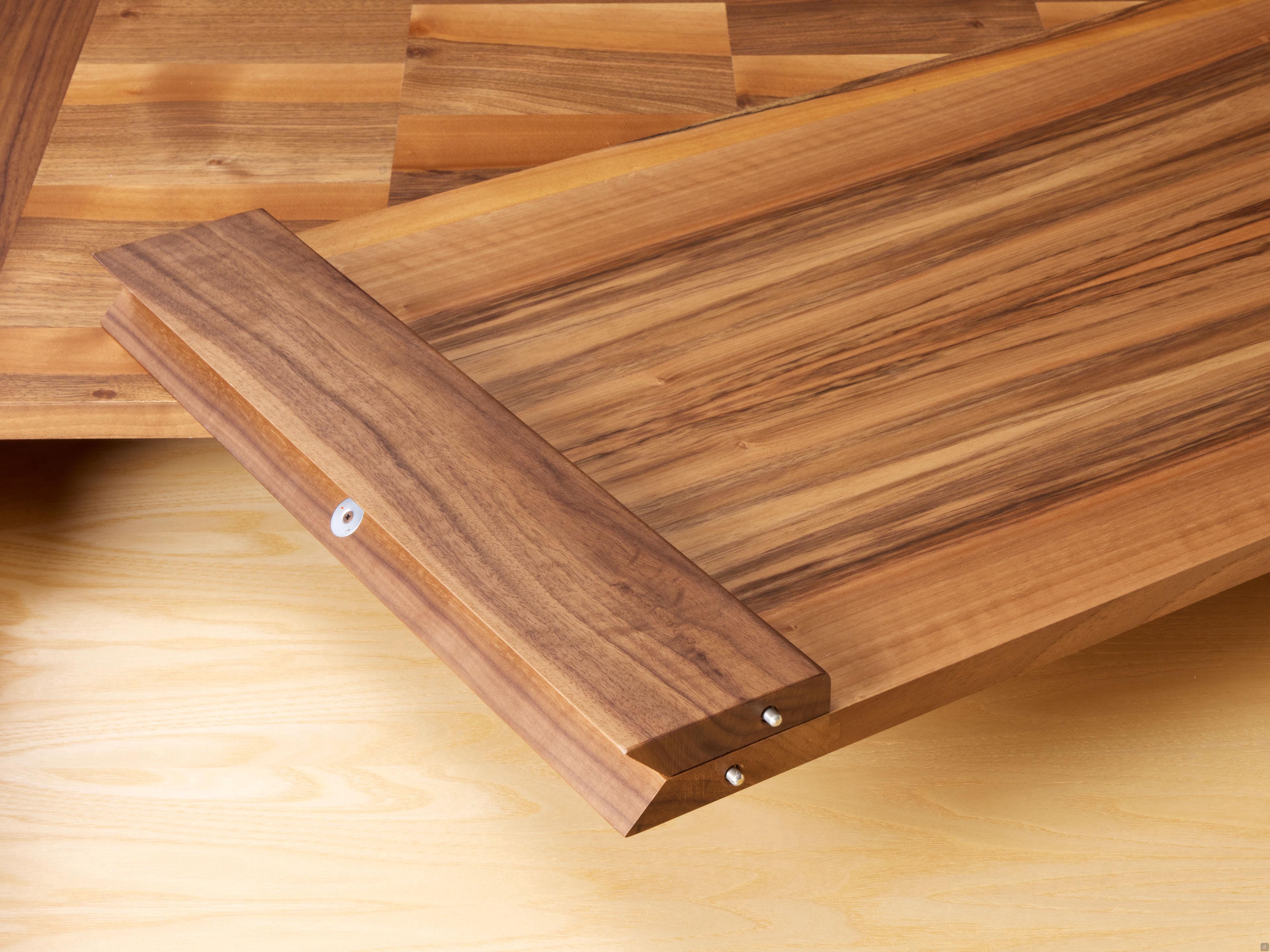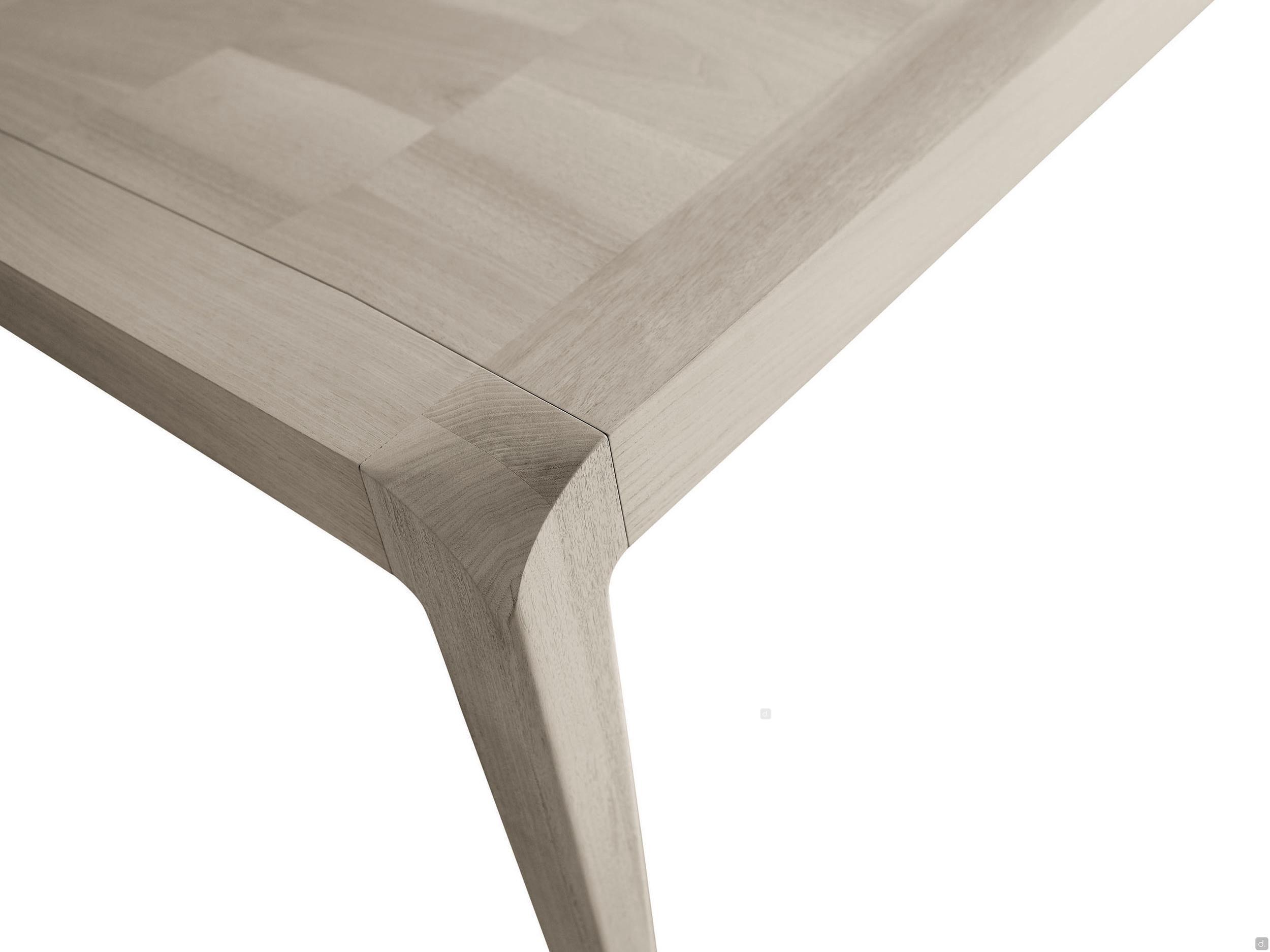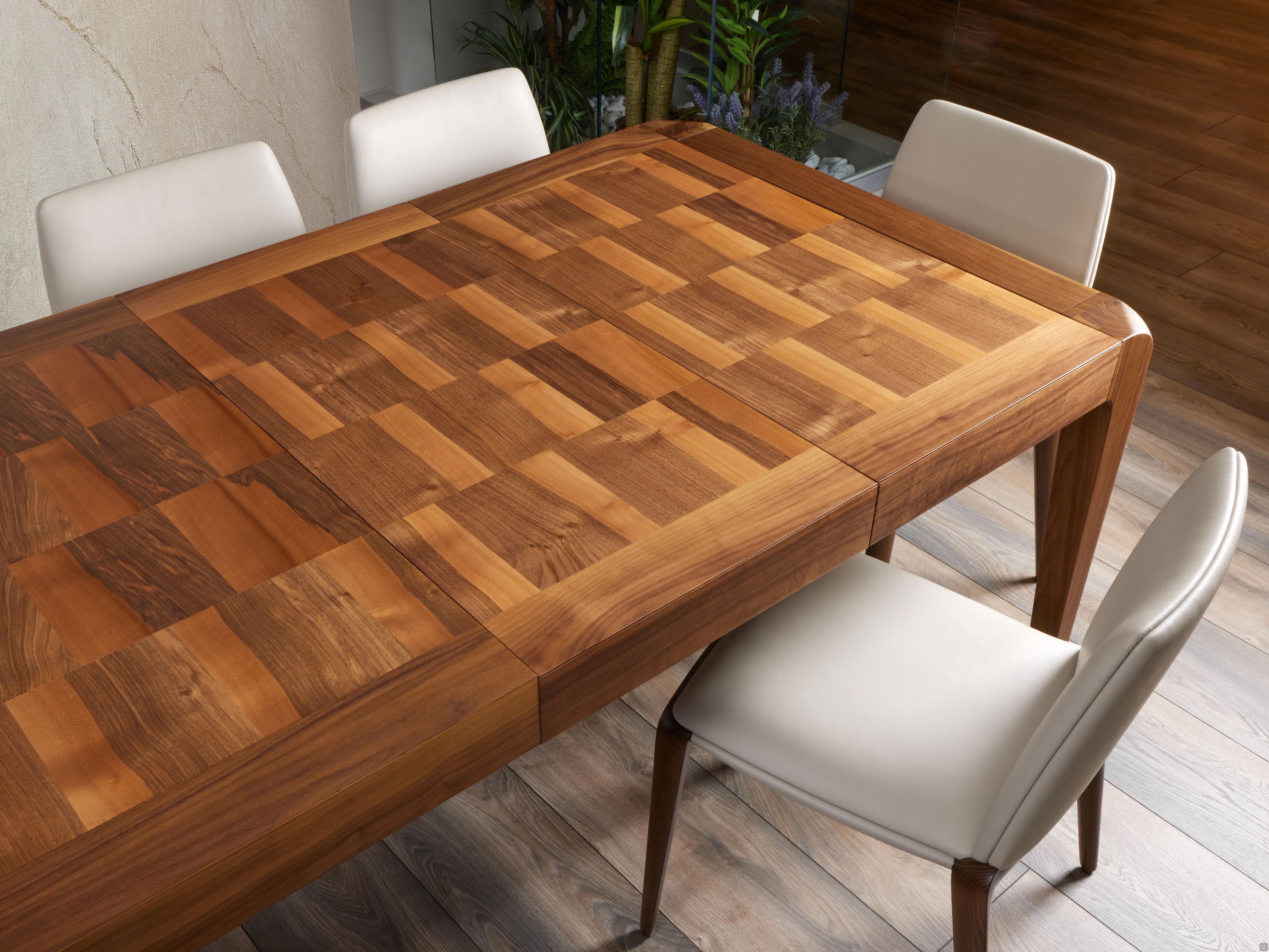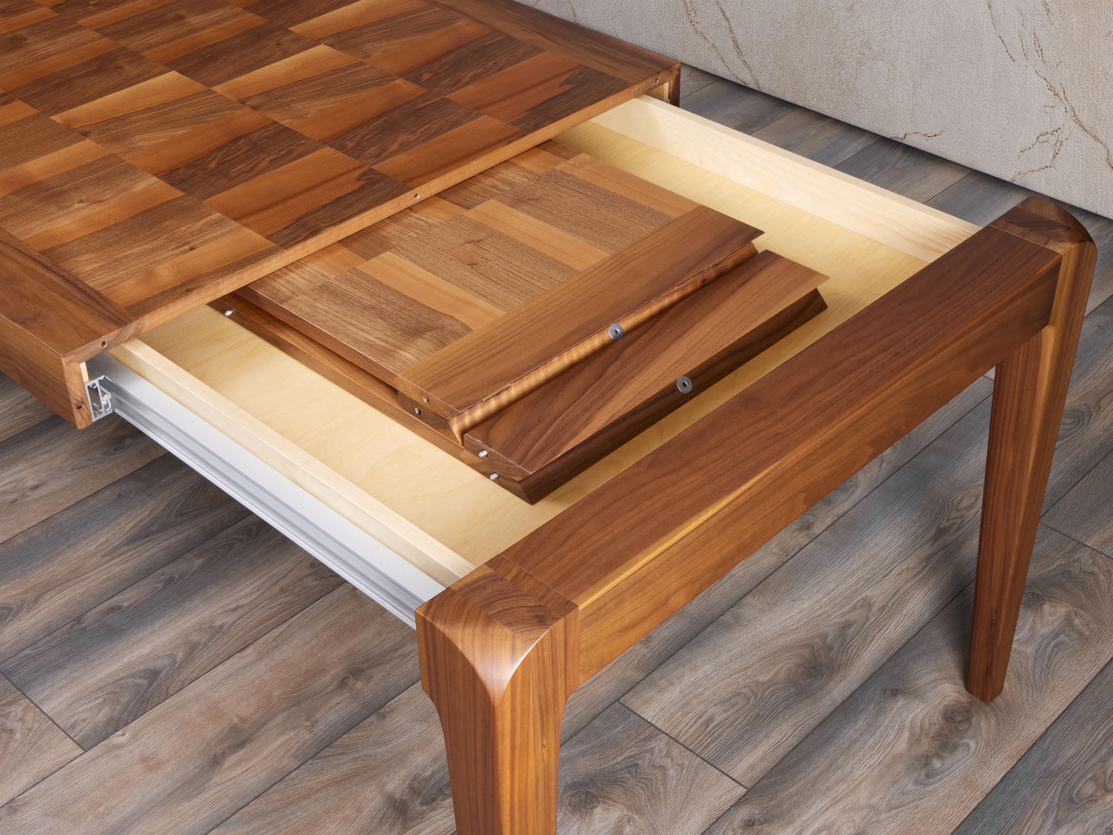 Dimensions Longueur: 110-170 / 190-290 cmProfondeur: 100 / 110 cmHauteur: 78 cmÉpaisseur Plateau: ép.10 cmMatériaux et Finitions Structure et Pieds: - bois massifPlateau: - bois lamellé collé avec décor intarsia