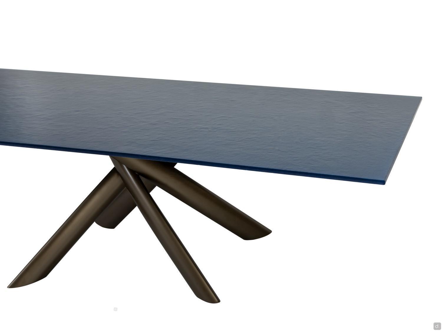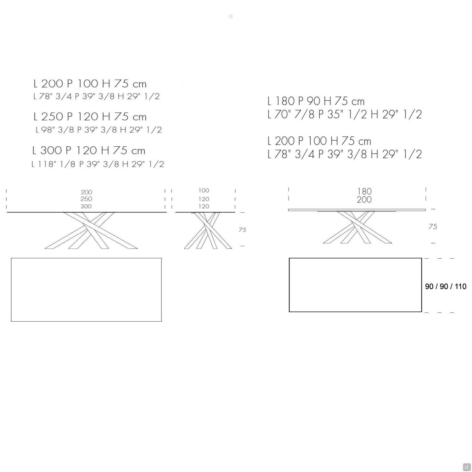 Plateau : en verre ép. 12 mm (sauf la finition "verre V100B extra-clair transparent biseauté" et les finitions V02M et V34M avec plateau ép. 15 mm). Les plateaux en grès cérame ont une ép. 16 mm (sauf les dimensions de 300x120 cm qui ont une ép. 18 mm) les plateaux en bois sont disponibles avec une épaisseur de 30 mm (sauf les plateaux avec bord incliné et irrégulier qui ont une ép. 40 mm). Les plateaux en marbre ont épaisseur de 20 mm.