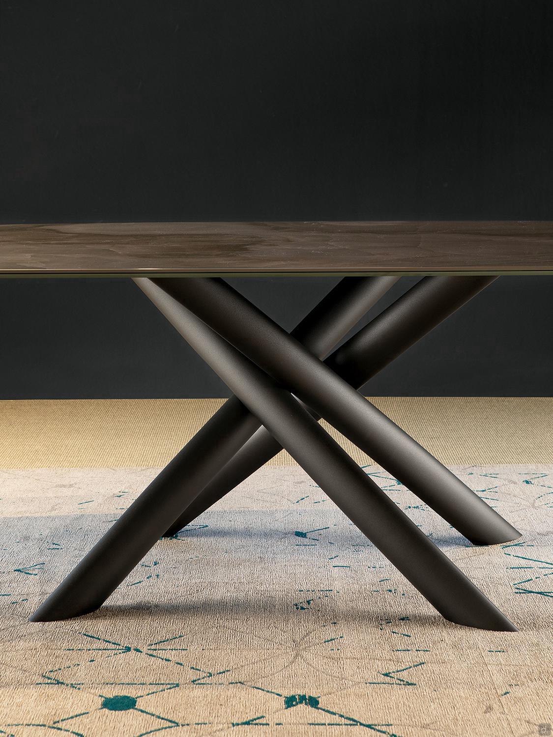 Plateau en grès cérame : consiste en la combinaison d'une feuille inférieure de verre de 10 mm d'épaisseur et d'une feuille supérieure de céramique de 6 mm d'épaisseur. Le grès cérame est un matériau compact, résistant au gel et aux attaques chimiques. À l'extérieur, les caractéristiques les plus précieuses du matériau sont les variations de couleur, les veines et les légères mouchetures : il s'agit de diversifications délibérées visant à recréer le caractère aléatoire et la beauté des matériaux naturels.