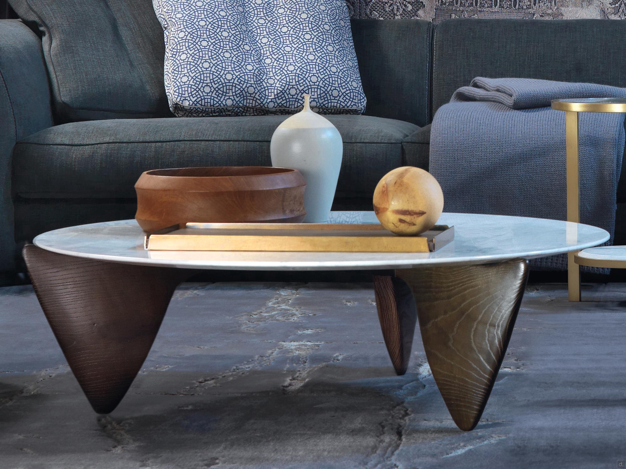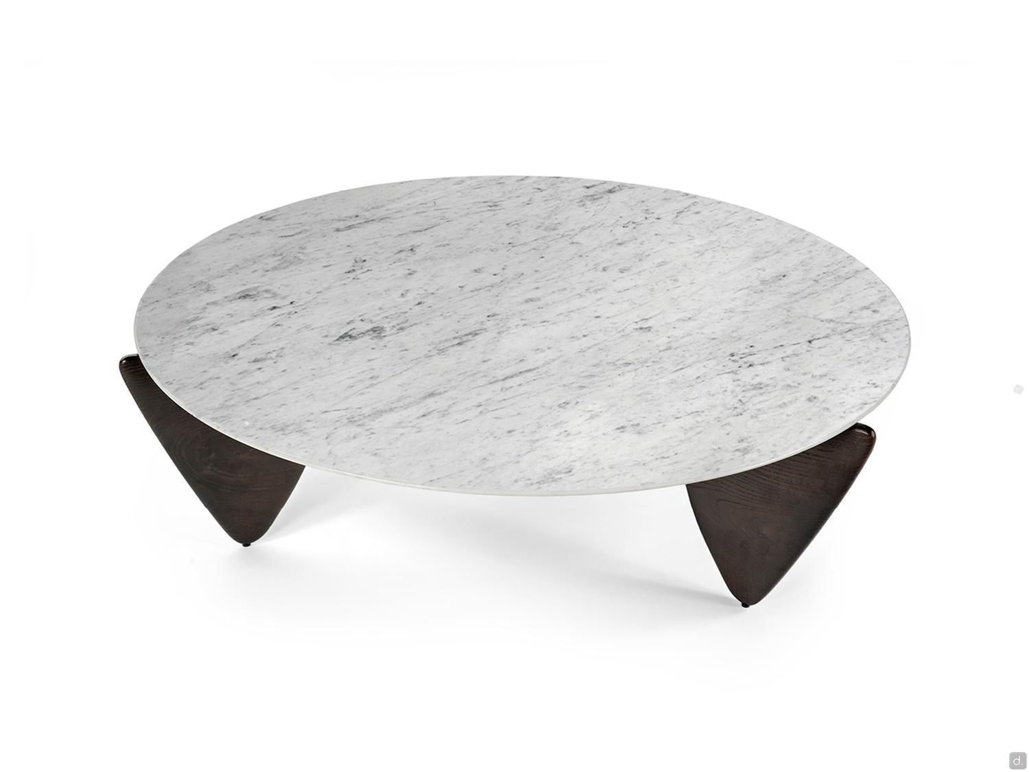 Caractéristiquestable basse ronde de 100 cm de diamètre et de 31 cm de hauteur pour une utilisation en front de canapépieds triangulaires en chêne ou noyer Canaletto, teinté ou laqué RALplateau en marbre avec de nombreuses finitions au choix, uni ou avec des veines contrastéesdes formes essentielles et marquantes pour un look original et futuriste