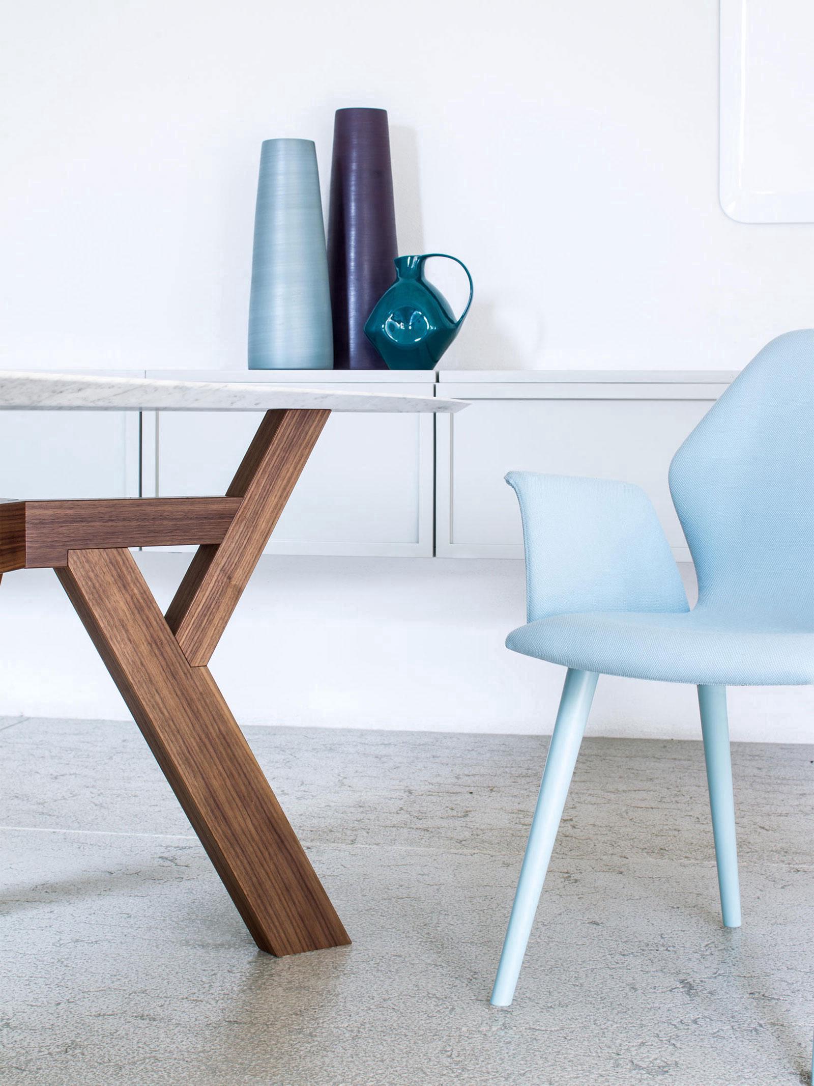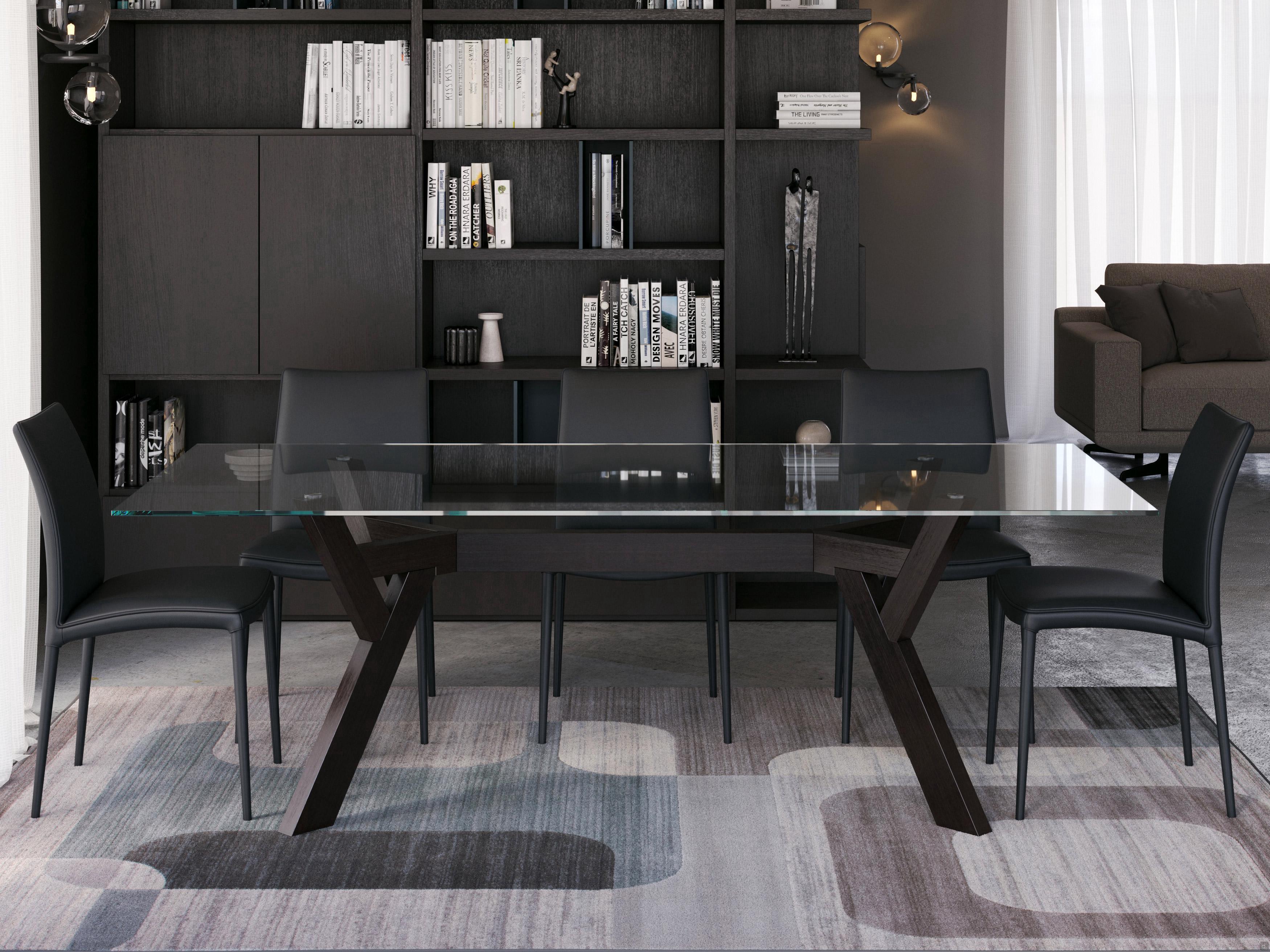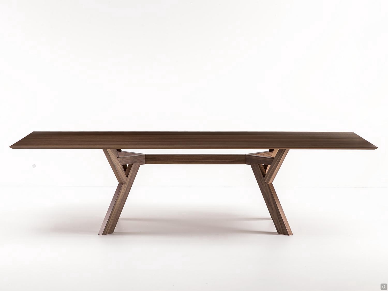 Larkin est une table de salle à manger en bois massif disponible en version ronde avec un diamètre de 130 ou 160 cm, ou rectangulaire avec une longueur de 220, 250, 280 ou 300 cm, pouvant accueillir confortablement jusqu'à 12 personnes.Un élément caractéristique est sa base sculpturale en noyer canaletto massif ou en chêne teinté ou laqué à pores ouverts, inspirée du monde de l'architecture et des charpentes en bois. Le plan assorti est proposé dans différents matériaux, ce qui permet d'obtenir différents effets : le plan en verre transparent est parfait pour faire ressortir les formes sculpturales de la structure, qui reste visible même d'en haut ; le plan assorti au piétement, le bois devenant le véritable protagoniste de la pièce ; enfin, le plan en marbre blanc de Carrara pour un contraste élégant.Grâce aux nombreuses combinaisons de tailles et de finitions, la table Larkin trouve sa place idéale dans toute salle de séjour moderne, ainsi que dans des salles de réunion de bureaux contemporains.