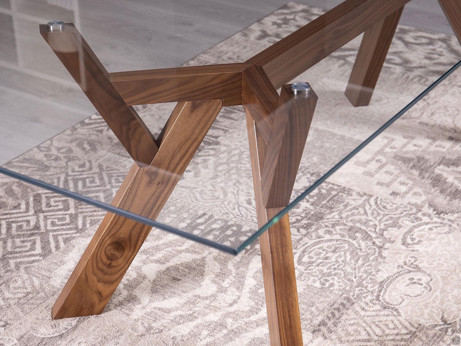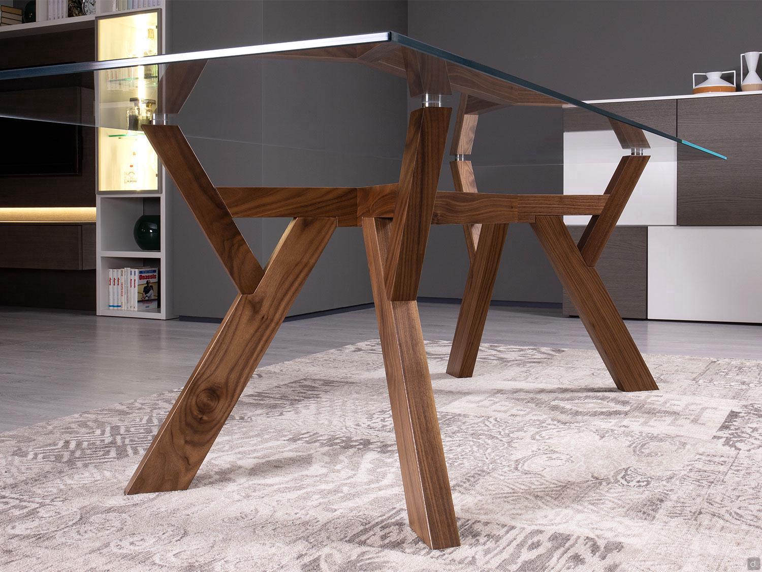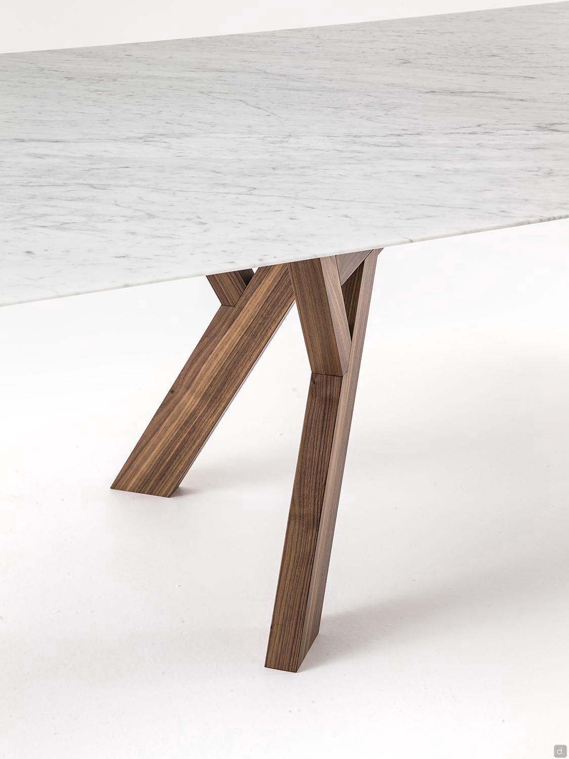 Table à manger rectangulaire ou ronde Larkin avec structure-sculpure en tréteau en bois massif et plateau en verre, marbre Carrara ou bois. Jusqu'à 12 convives