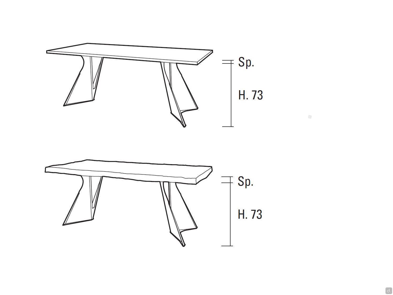 DimensionsHauteur Pieds: H.73 cmÉpaisseur du Plateau:- ép.3 cm (mélaminé / chêne naturel) - ép.5 cm (chêne écorcé) - ép.6 cm (chêne antique)Matériaux et FinitionsPlateau:- mélaminé HPL / Fenix- bois essence Pieds:- métal verni