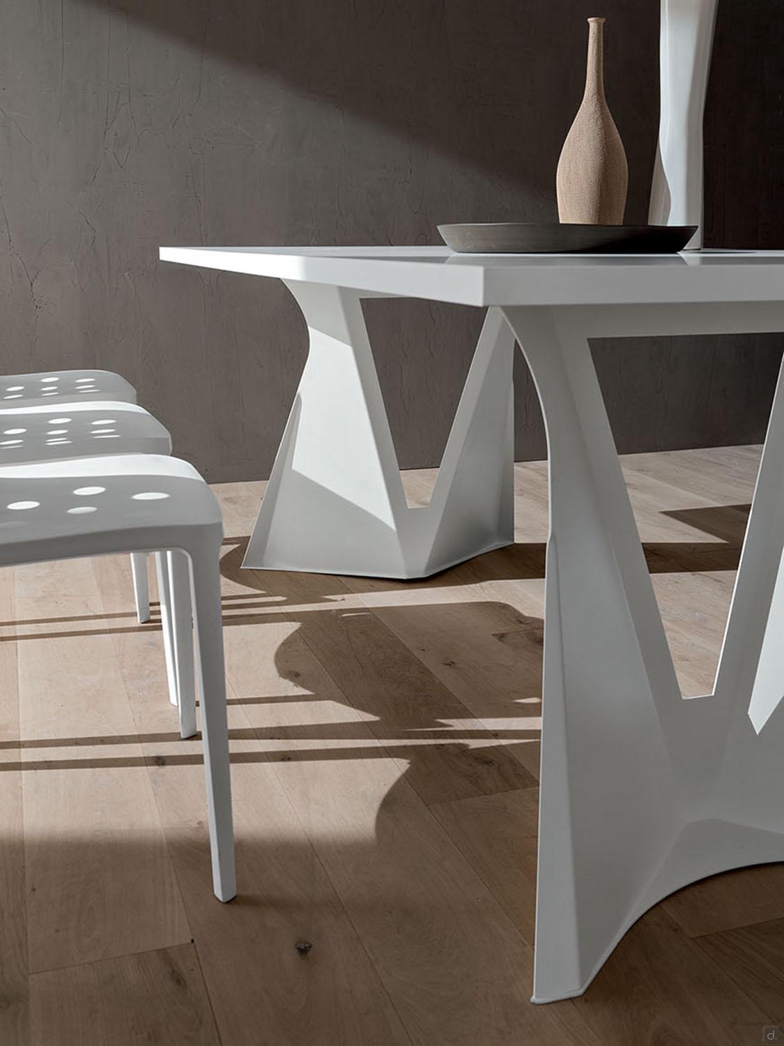 Jeor est une table à manger avec pieds design en métal, de forme originale en tréteaux. Le plateau est disponible en bois essence, chêne naturel, également écorcé, ou en chêne antique ou encore en mélaminé HPL ou Fenix dans de nombreux coloris. Les pieds en tréteaux présentent une forme singulière et symétrique et sont réalisés en métal verni disponible en blanc, gris londres ou anthracite. Il est possible en outre de réaliser des assortiments de couleur ou des contrastes entre le plateau et les pieds, en fonction des couleurs choisies.Jeor est une table aux lignes importantes, idéale pour les amateurs de design massif et par la conjugaison du métal et du bois.