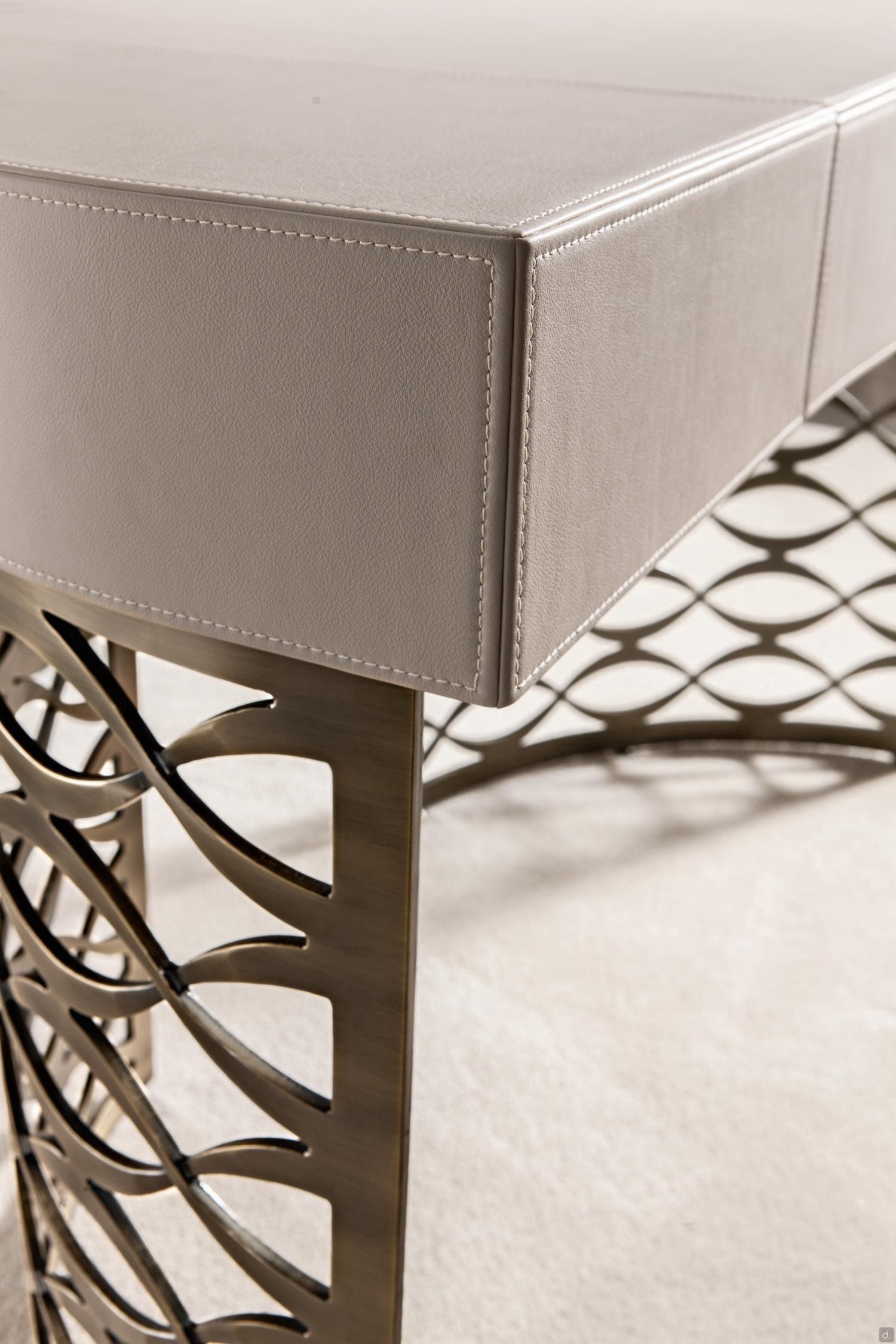 Isidoro de Cantori est une table de maquillage avec tiroir et dessus entièrement rembourré en cuir cousu à la main. La structure est faite de métal découpé au laser, fraisé et courbé pour former un dessin en hélice tridimensionnel à fort impact visuel. Le tiroir encastré maintient les lignes du dessus esthétiquement épurées. La forme semi-circulaire de la partie supérieure combinée à la finition de la table de maquillage sur tous les côtés font qu'Isidoro est également parfait pour être placé au milieu de la pièce.