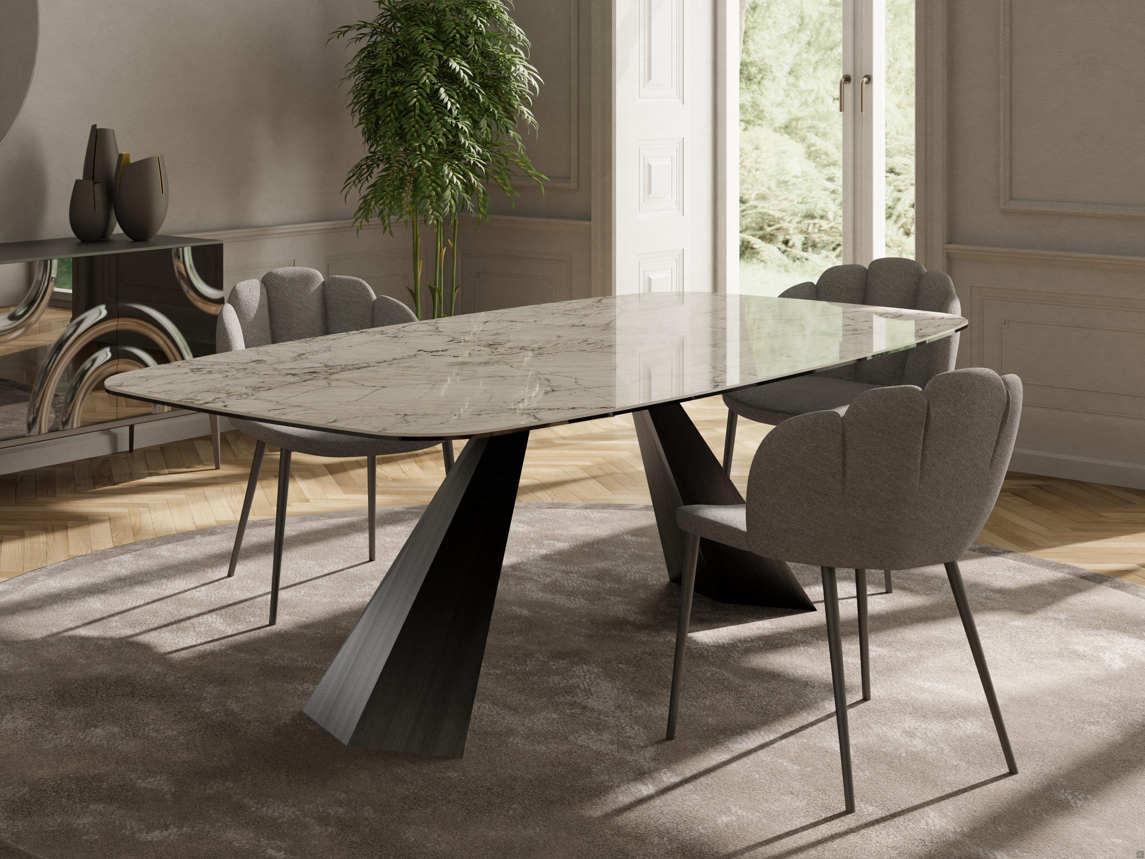 Shore est une table moderne en verre céramique caractérisée par le design particulier de ses pieds en métal mettant en valeur le plateau de la table donnant alors une certaine légèreté à la structure. L'élégant plateau en vitrocéramique est disponible dans de nombreuses dimensions, avec table fixe ou bien extensible jusqu'à 3 mètres permettant alors d'accueillir jusqu'à 12 personnes. Le plateau est également disponible en laminé HPL, mélaminé, plaqué bois ou en verre dekor. De nombreuses finitions vous permettent de personnaliser cette table selon vos goûts.