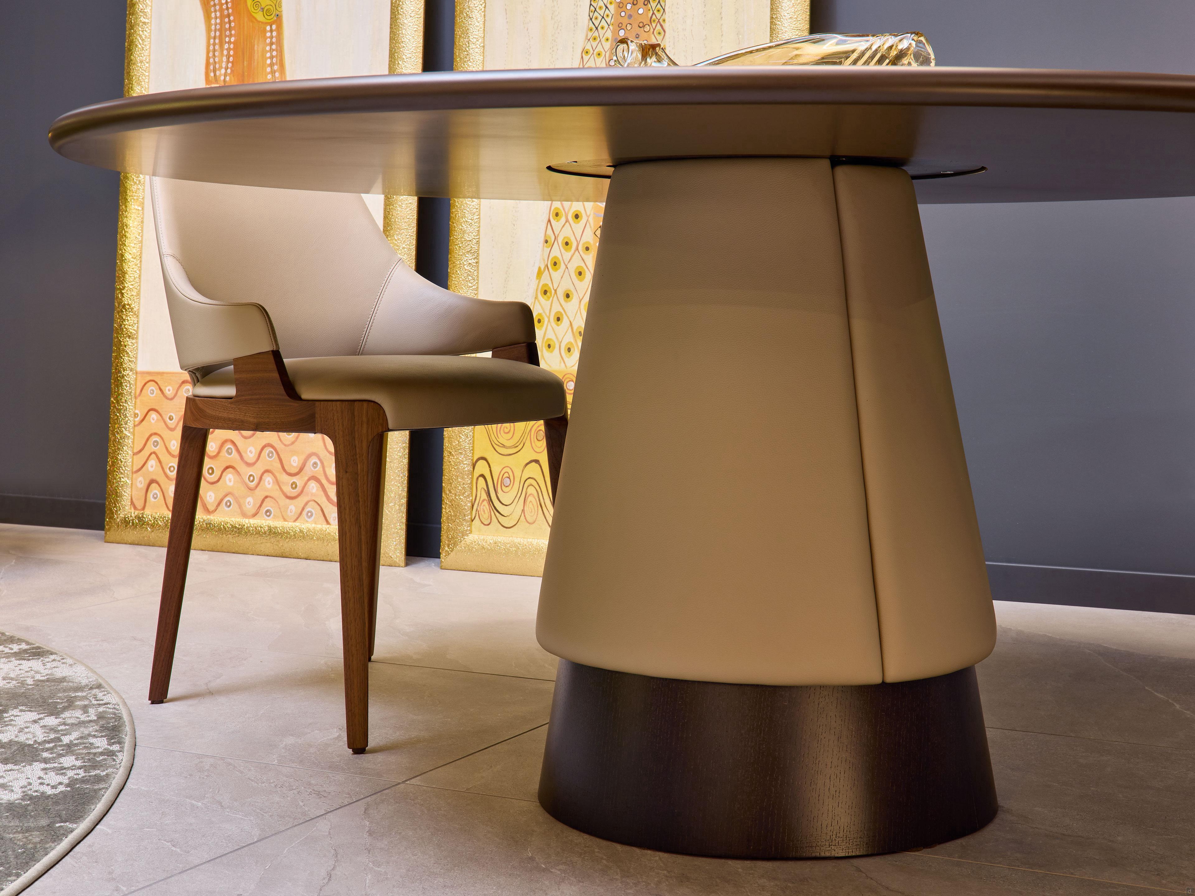 Hamide est une table ronde avec pied conique design de 140ou 160 cm di diamètre, un meuble important qui se caractérise par l'utilisation de matériaux naturels et par l'esthétique " soft curves ", aux formes douces, enveloppantes et contemporaines.Hamide est composée d'un piétement sculptural, un socle tronconique en frêne teinté ou en pierre naturelle, assorti à un plateau rond en bois ou en céramique. Le socle est également agrémenté, dans sa partie supérieure, d'un revêtement en tissu, en similicuir ou en cuir, tous disponibles dans une multitude de variétés, textures et couleurs.Tant le revêtement du socle que le placage bois peuvent être coordonnés avec les finitions des pieds en bois massif et le rembourrage des chaises et des fauteuils de la famille Hamide pour créer une salle à manger raffinée et élégante.