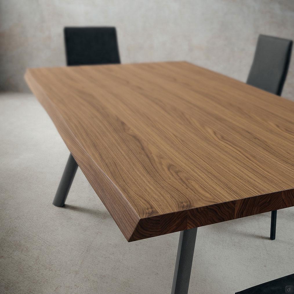 La table Jason avec plateau en bois écorcé présente deux côtés courts avec un bord droit.