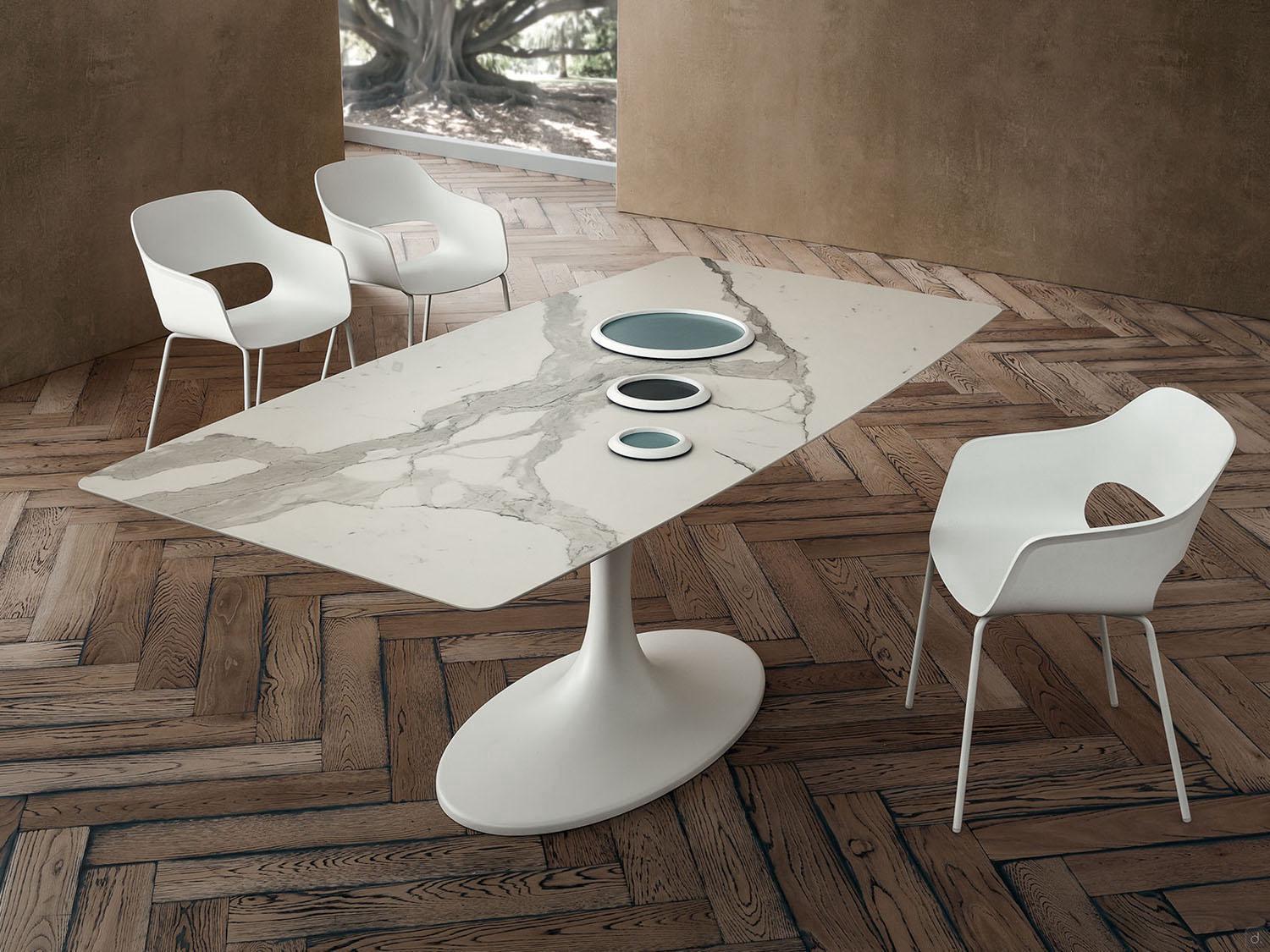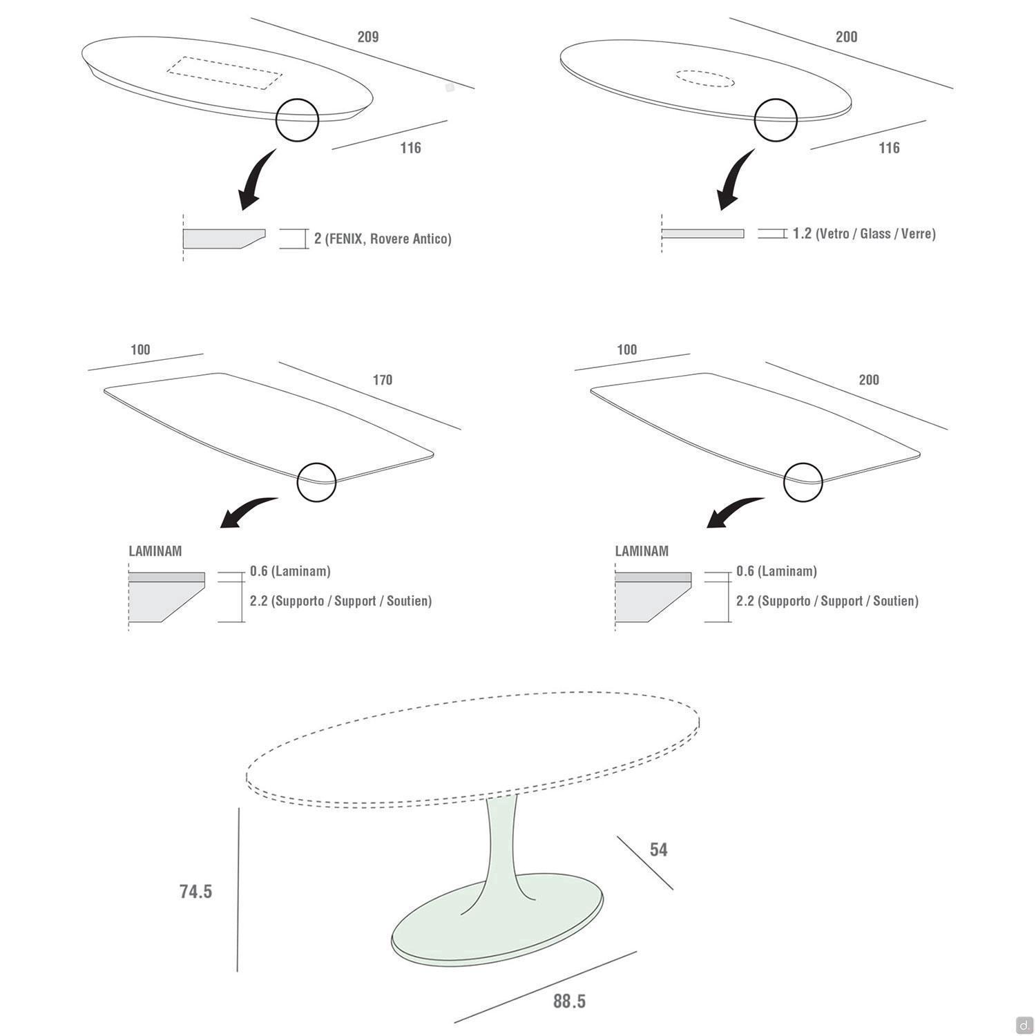 DimensionsHauteur Base: H.75 cmÉpaisseur Plateau: - mélaminé / essence bois: ép.2 cm- verre: ép.1,2 cm- pierre Laminam: ép.2,8 cmMatériaux et FinitionsPlateau:- mélaminé Fenix- essence bois- verre trempé transparent / laqué mat- pierre LaminamStructure:- marbre synthétique