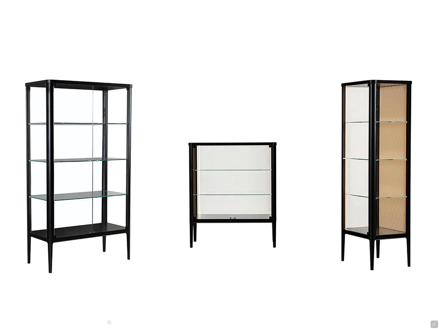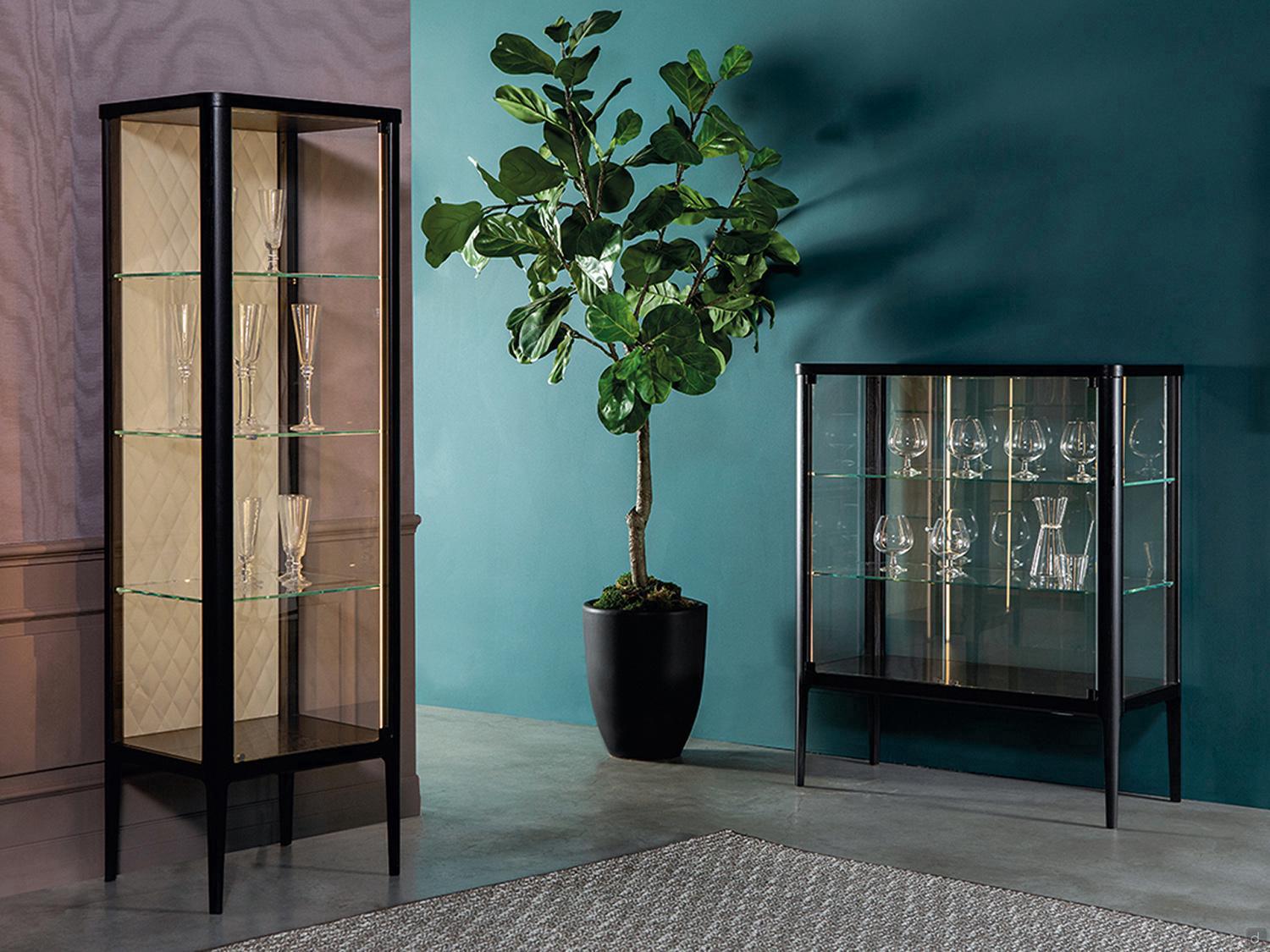 Epoch est une élégante vitrine avec structure en bois, disponible en trois dimensions différentes et avec une finition personnalisable. Idéale dans les contextes formels, tant modernes que classiques, elle permet d'exposer des objets de famille, des objets de collection, des verres ou d'autres accessoires pour les mettre en valeur dans un salon. Dotée d'un éclairage LED intégré, la vitrine Epoch peut être double face, avec des panneaux arrière en verre extra-clair comme les portes, ou avec un panneau arrière en cuir matelassé, posée contre un mur.