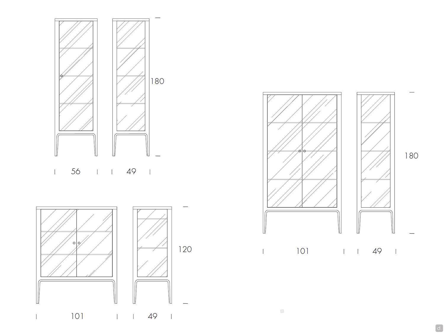 Dimensions- 56 x P.49 x H.180 cm- 101 x P.49 x H.120 / 180 cmMatériaux et FinitionsStructure :- essence boisétageres et portes :- verre transparént extra-clairPanneau arrière :- verre transparént extra-clair- cuir matelassé à losanges