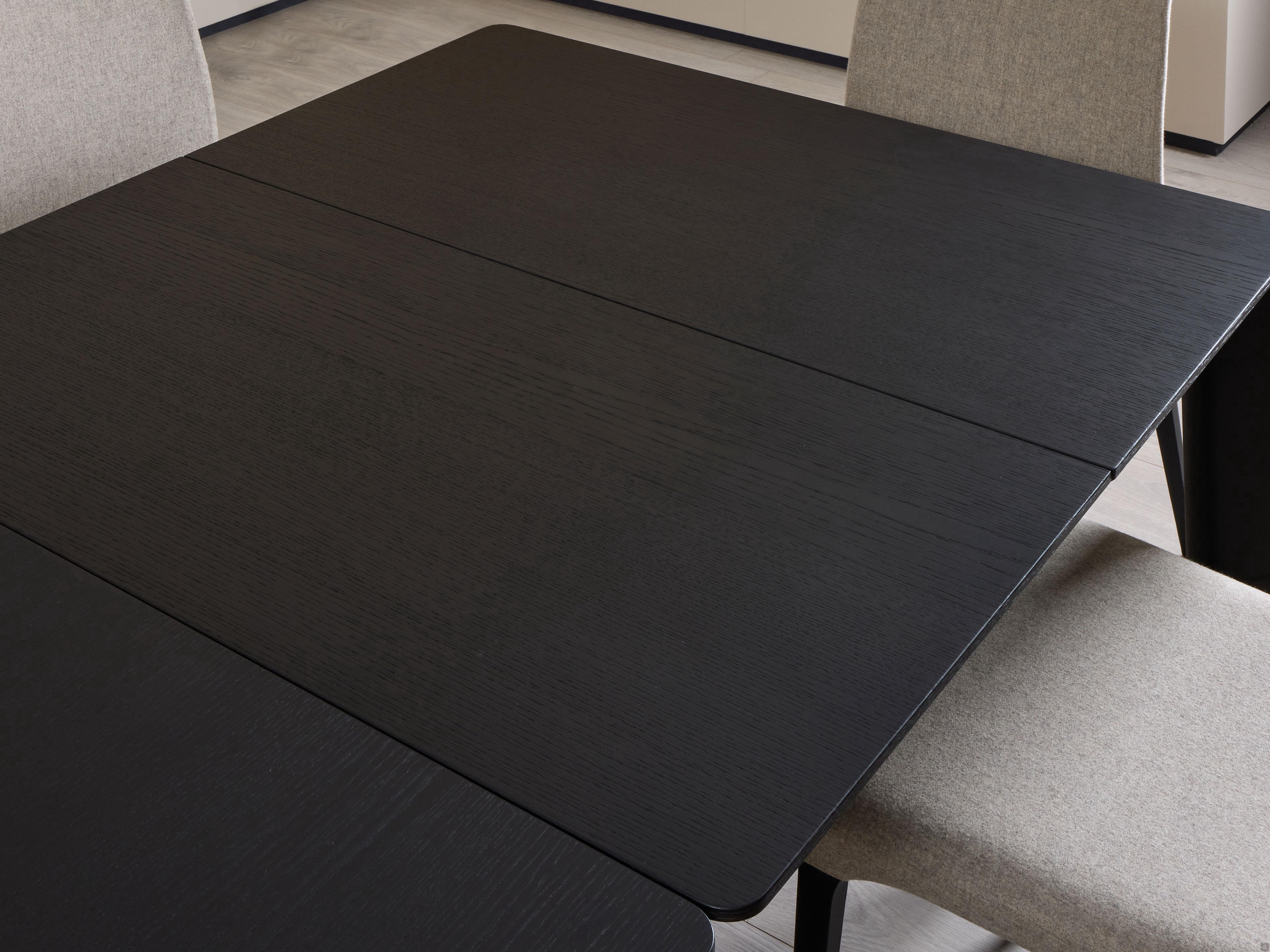 La table carrée ou rectangulaire extensible Winston est conçu pour accueillir jusqu'à 8 ou 12 personnes. Le plateau en céramique précieuse ou en bois à l'air léger se détache sur les 4 pieds importants en essence de bois ou laqués brillants. Le plateau en grès cérame de la table à manger est particulièrement mis en valeur par les pieds en bois, dont la finition soignée fait ressortir les veines du bois. La forme modelée et ligèrement biseautée des pieds, très élégants dans les finitions en noyer et en chêne en différents coloris, se marie parfaitement avec le plateau aux angles arrondis. Pour les tables extensibles, le cadre sous-plateau réalisé en métal cache l'espace de rangement des allonges intégrées assorties.Winston, également disponibles dans les modèles fixes, est caractérisé par un design à la fois épuré et moderne, mais aussi particulier. Grâce à sa polyvalence et sa sobrieté, cette table de repas convient aussi bien à des salles de séjour aux finitions classiques qu'à des livings ou des espaces ouverts modernes et colorés.