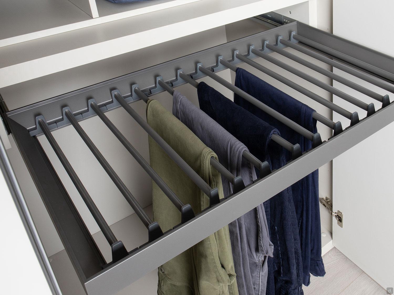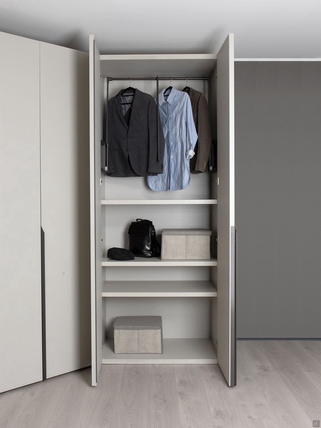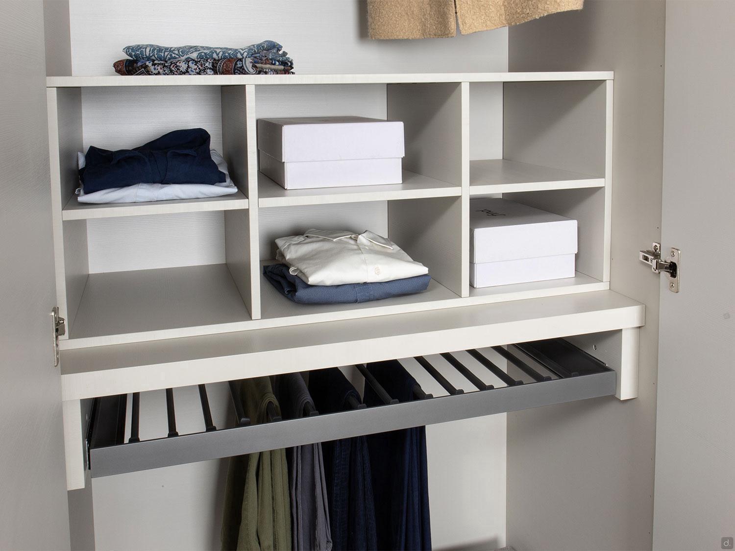 Il primo modulo ad anta singola è pensato per riporre scatole o abbigliamento ripiegato: è infatti dotato di cinque ripiani. Tra le attrezzature interne dei due moduli a due ante battenti spiccano un portapantaloni estraibile con raster porta camicie in appoggio e un servetto che consente di appendere capi con estrema facilità e senza il minimo sforzo.