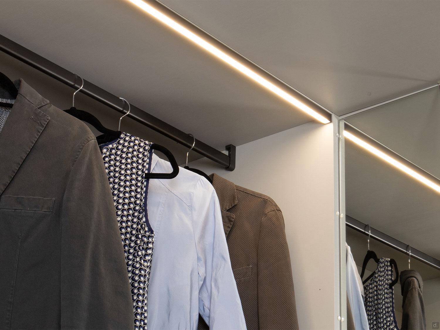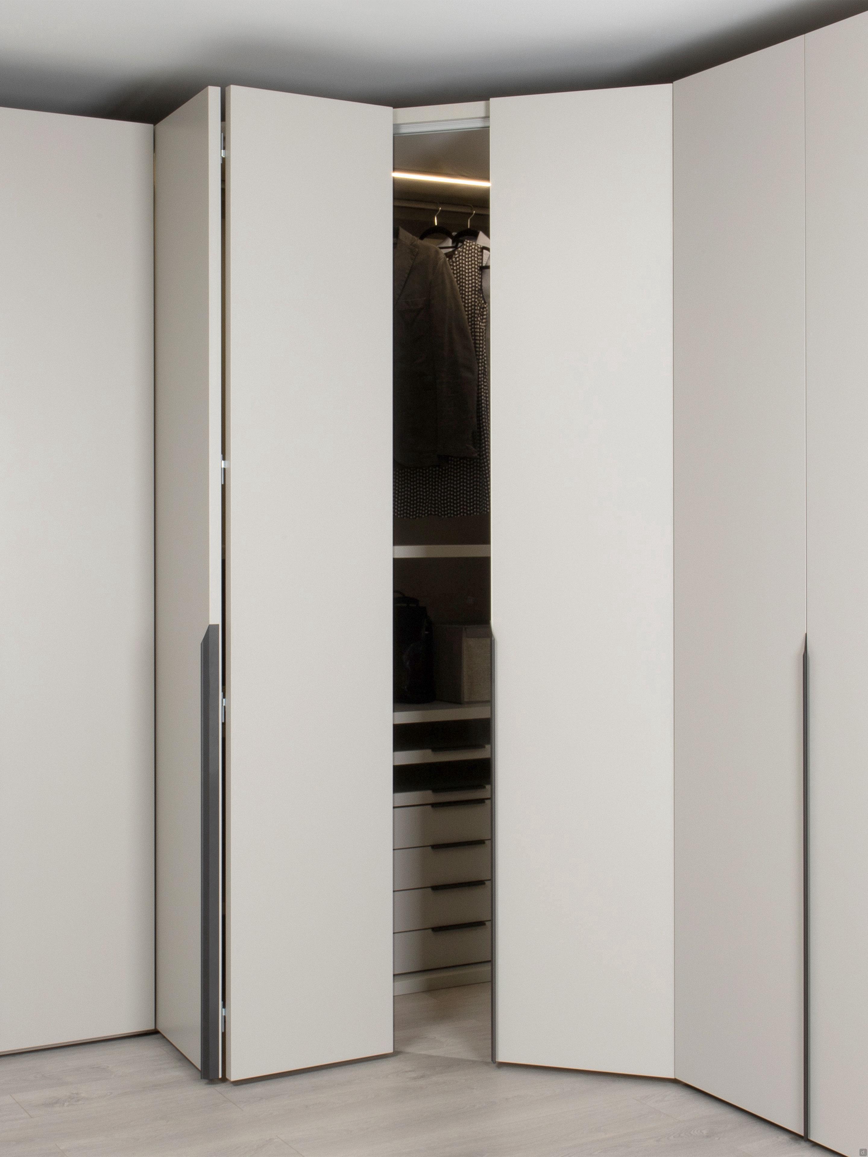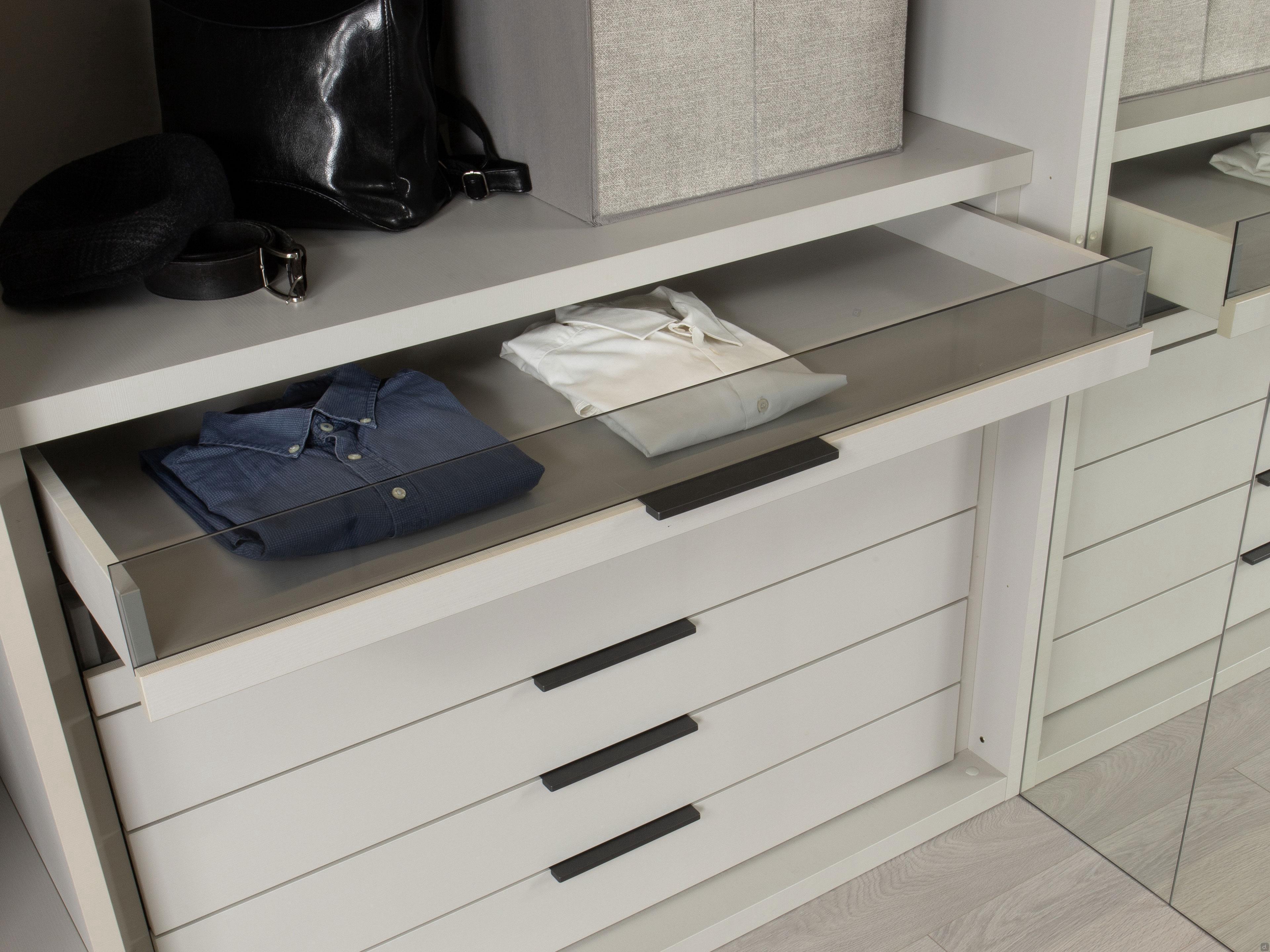 Una coppia di ante a soffietto e un'anta battente danno accesso al vano spogliatoio che, illuminato da barre Led, è internamente dotato di uno specchio e di una cassettiera con sei cassetti, di cui due con frontali in vetro.