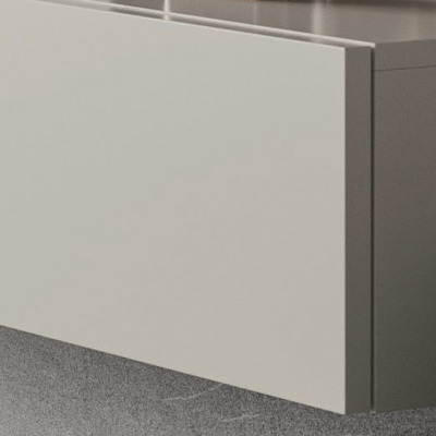 retroilluminazione LED: per avere il contenitore retroilluminato tramite strip LED è necessario inserire, tra il contenitore e la parete, il pannello distanziale sp.1,4 cm sempre in finitura nobilitato piombo (la profondità della base aumenterà di conseguenza di 1,4 cm). Il pannello distanziale viene fissato a parete mentre il contenitore viene agganciato al pannello distanziale con le attaccaglie in dotazione. Lo strip LED emette luce calda a 3000 K e viene posizionato posteriormente sui lati lunghi della base tramite fresate su top o fondo. Il trasformatore è posizionabile sia nel vuoto sanitario dietro la base sia sotto al fondo.