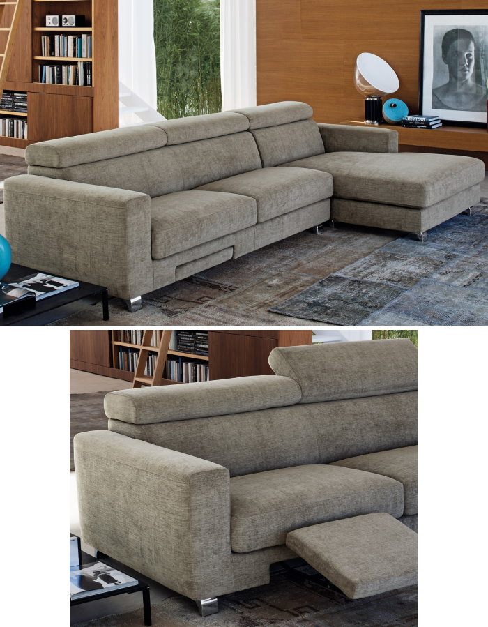 • divano con poggiapiedi: il meccanismo estraibile manuale consente di ottenere un comodo poggiapiedi a scomparsa integrato. Perfetto se combinato a poggiatesta regolabili