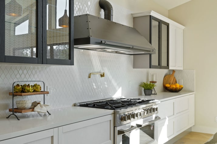 Nella cucina a progetto, lo stile total white è in realtà intervallato da eleganti punte di nero, colore scelto per il piano di lavoro dell’isola, la cappa a vista e i telai che incorniciano le vetrinette.