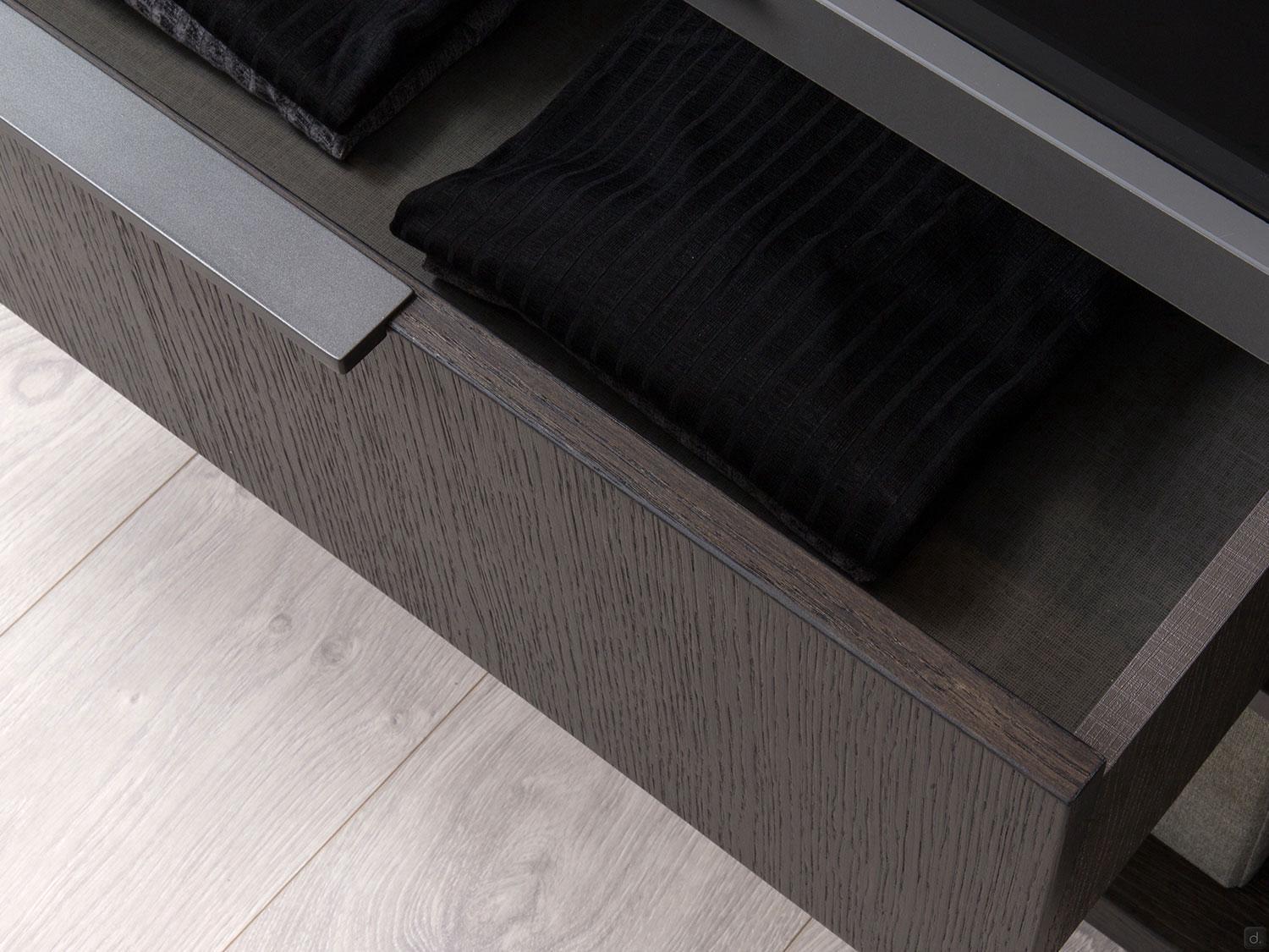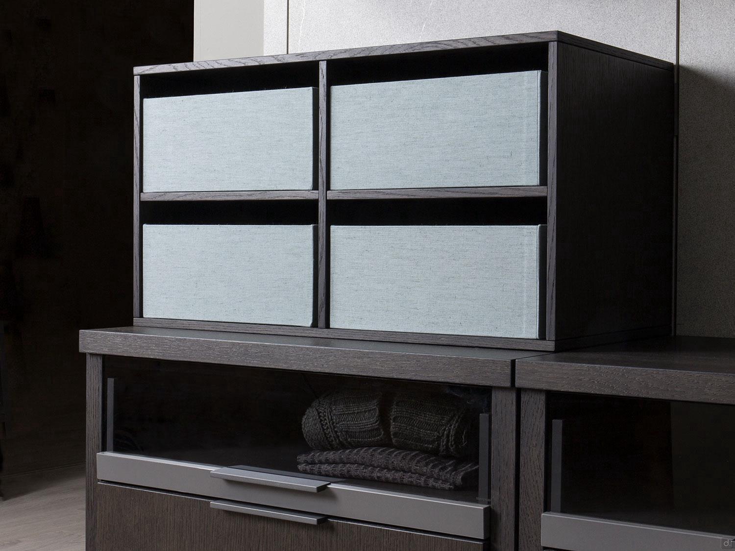 La Bliss Player outlet è una cabina armadio boiserie ad U con sistema a cremagliera, progettata per offrire praticità e massima organizzazione.E' proposta in una elegante doppia finitura: i pannelli di schienale in nobilitato effetto Pietra Piasentina si accostano alle attrezzature realizzate in legno Fashion Wood Rovere Carbone, creando un raffinato effetto materico. La composizione è completa di panca a terra, cassettiere sospese, raster con contenitori rivestiti in tessuto, ripiani e tubi appendiabiti per un'organizzazione ottimale degli spazi. I ripiani superiori integrano barre a Led incassate nella parte inferiore, che garantiscono una illuminazione omogenea a tutta la composizione. Uno dei pannelli di schienale è inoltre dotato di un vano ispezionabile con apertura ribalta, che consente l'accesso a eventuali quadri elettrici posti nella parete retrostante.