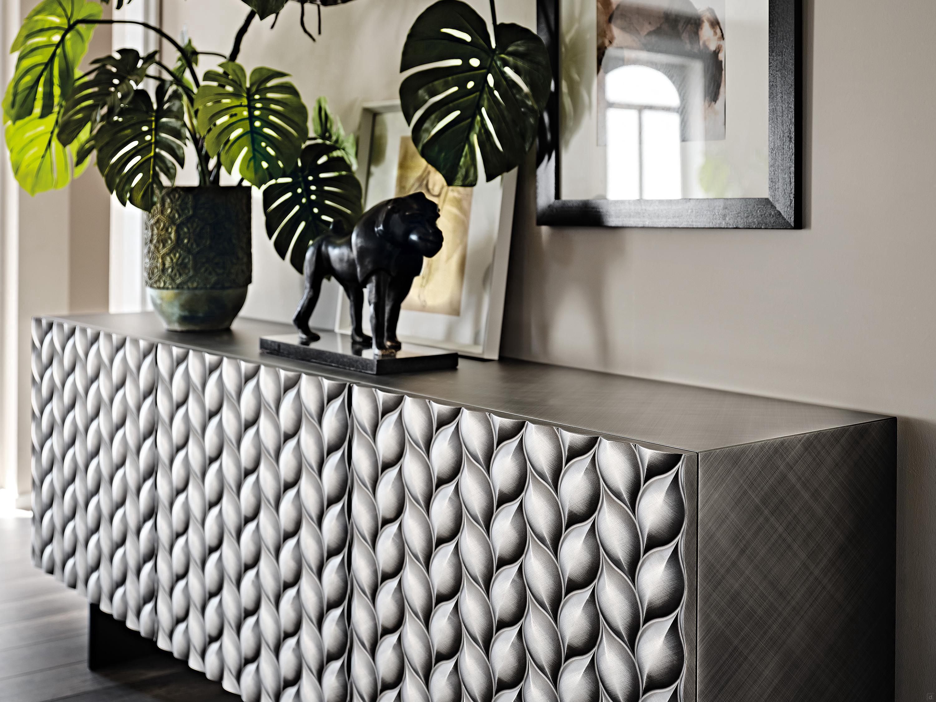 Lavander di Cattelan è una credenza moderna a 3 ante con piedini alti in acciaio inox lucido o verniciato.L'elemento distintivo del mobile buffet Lavander è la particolare lavorazione dei frontali con un motivo a foglie in rilievo che prosegue per tutta la larghezza. Particolare attenzione è data ai punti di contatto delle ante in modo che il motivo possa proseguire in maniera omogeneo ed armonico. Lavander è dotata di 2 ripiani interni in cristallo trasparente spessi 8 mm, che possono essere spostati in 3 differenti posizioni. Il cassetto interno opzionale, invece, è in finitura graphite.Lavander è disponibile in 2 larghezze: 147 cm a 2 ante, consigliata anche per completare un ingresso, o 220 cm a 3 ante, perfetta per la sala da pranzo per contenere piatti, bicchieri e quanto di utile per le cene importanti.