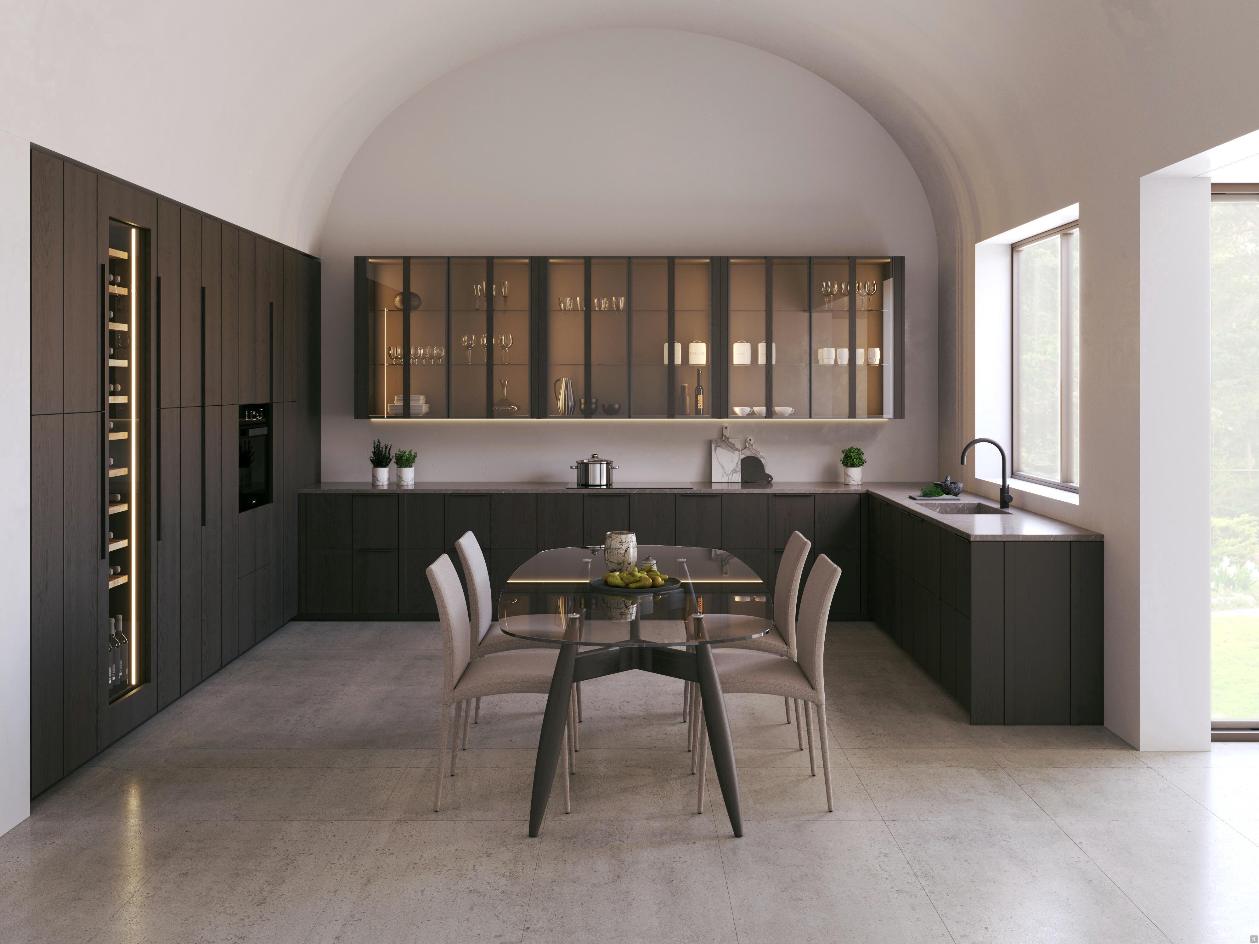 Plan Loto 02 è una cucina a ferro di cavallo moderna con cantinetta per vini a tutta altezza, preziosi pensili vetrina e ante dogate in olmo color carbone.