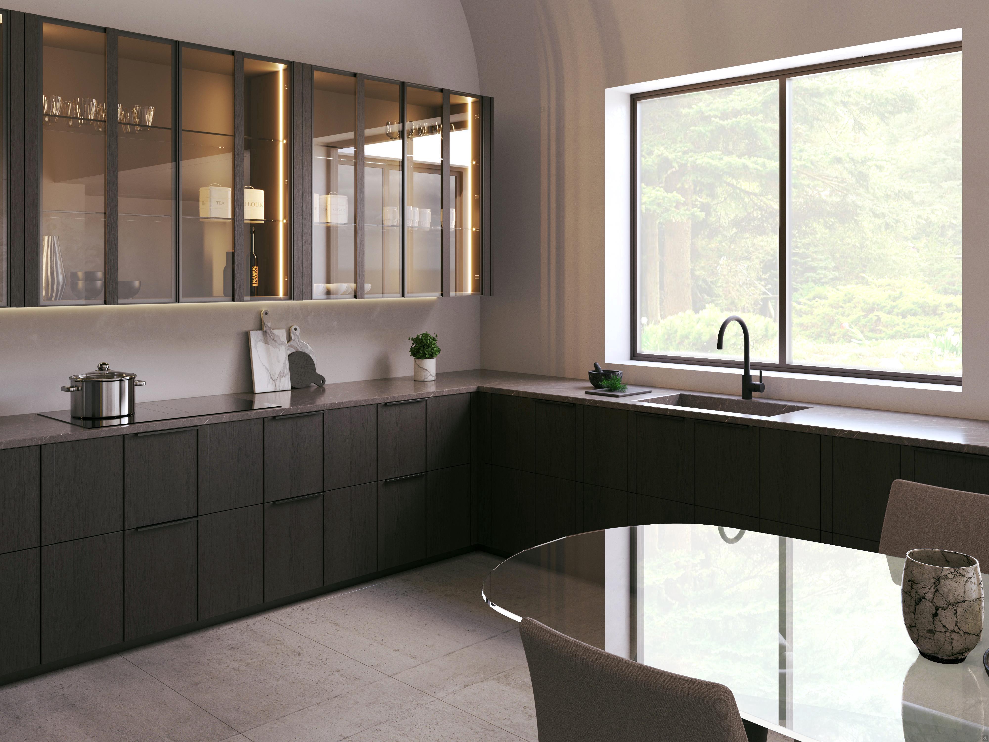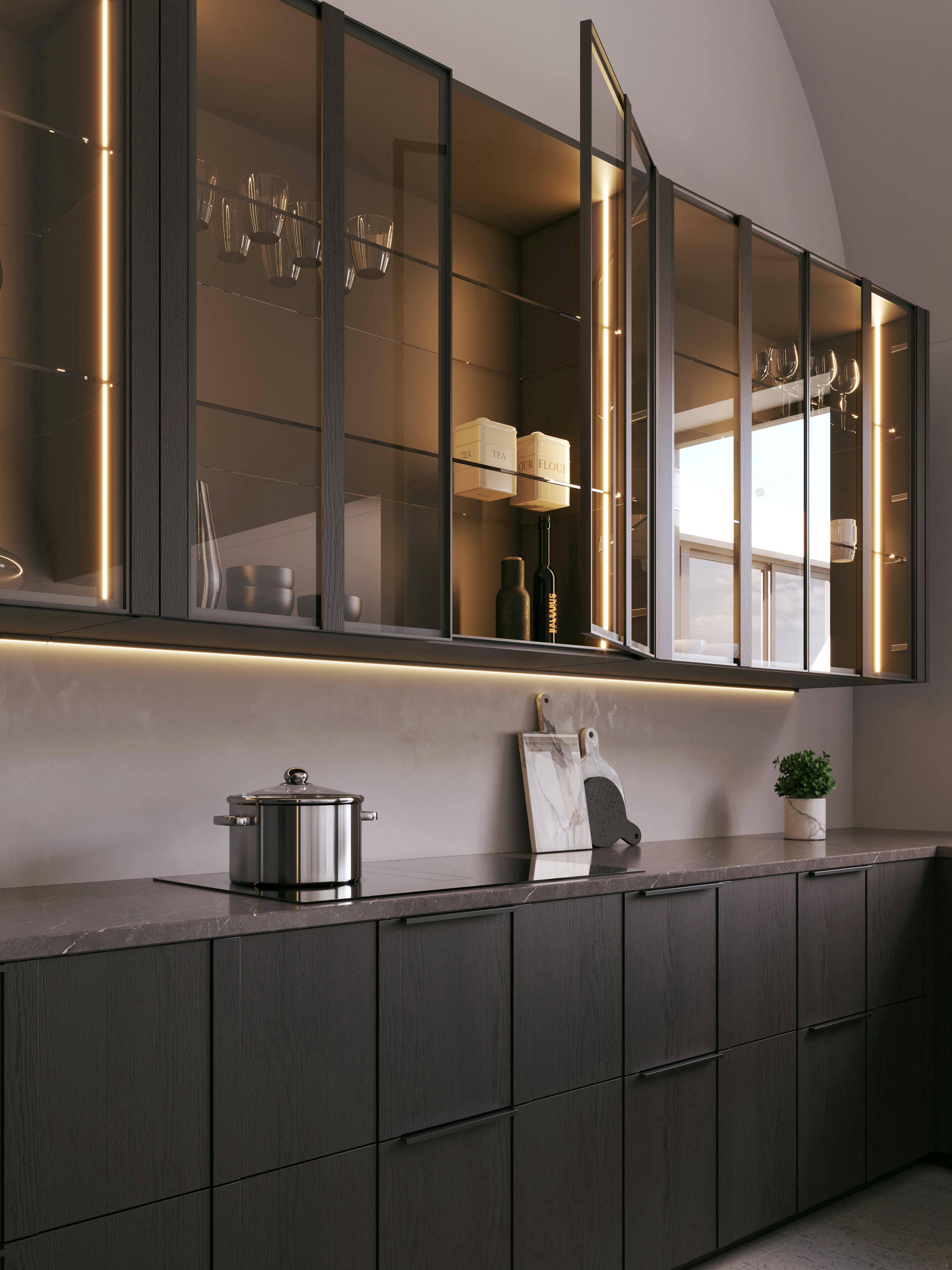 ante dogate moderne che conferiscono ritmo e prestigio artigianale alla cucina