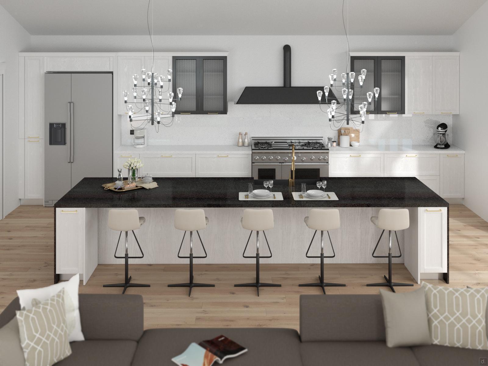 La parte di cucina che si sviluppa linearmente è dotata di ante, cassetti e cestoni disposti equamente a destra e a sinistra del forno, fulcro centrale della composizione che ne demarca la simmetria. Il modello di forno free-standing è stato scelto dal cliente, per cui ci siamo limitati a prevedere lo spazio necessario alla sua installazione, completando la zona cottura con la cappa d'arredo a vista. Abbiamo creato una nicchia a sinistra della composizione in modo che potesse ospitare al suo interno il frigo americano a doppia porta, anche questo in possesso dal cliente. La parte superiore è caratterizzata da una modanatura che incornicia i pensili e da 2 moduli con vetrine con telaio nero, tinta che risalta e movimenta la finitura total white.