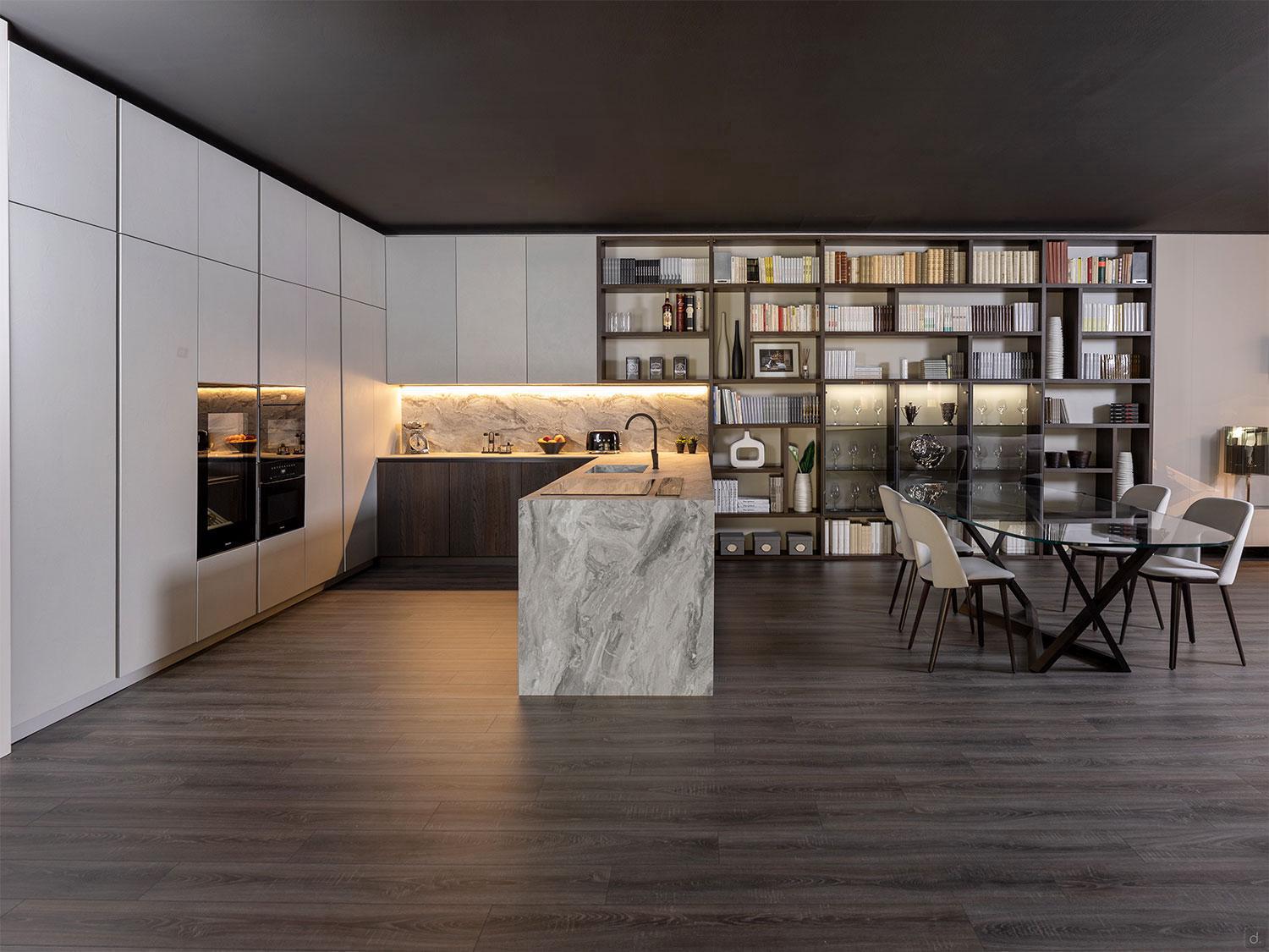 Caratteristichecucina a ferro di cavallo su misura della collezione Kitchen Labtop e ante personalizzabili in numerosi materiali e colorielettrodomestici a scelta tra le migliori marcheintegrazione con libreria componibile su misura perfetta per open space con cucina a vista