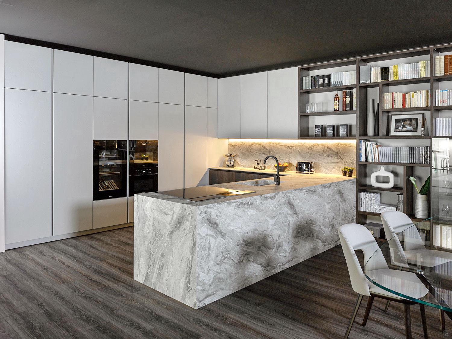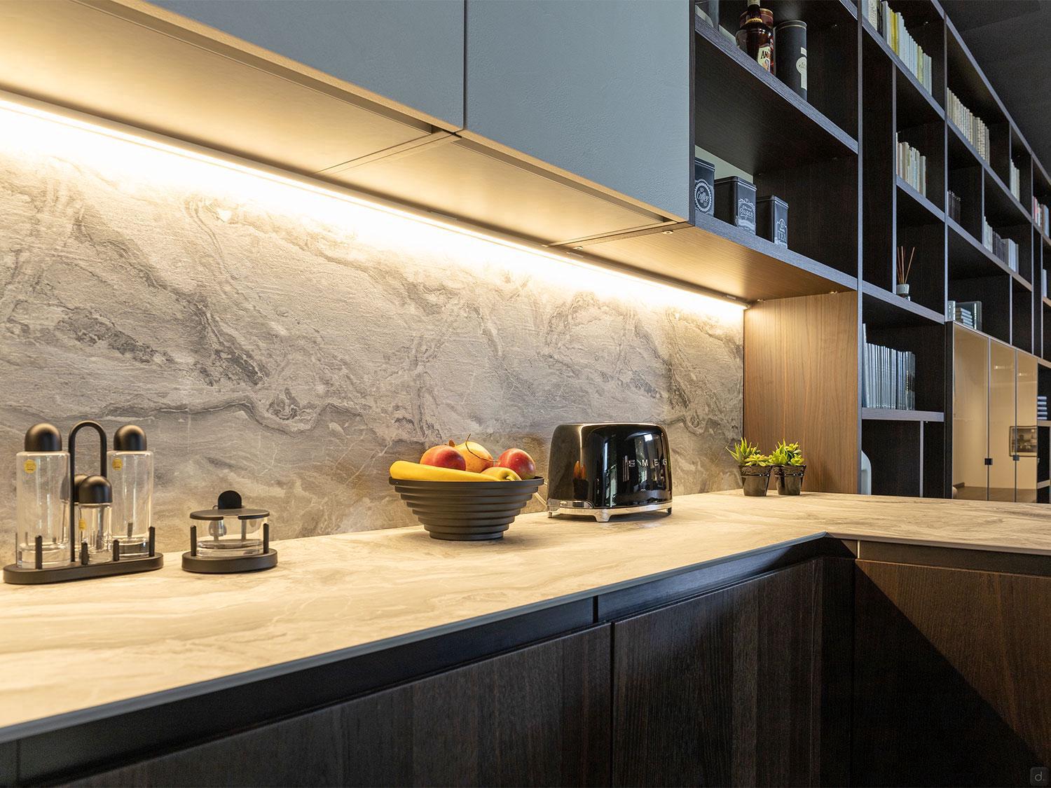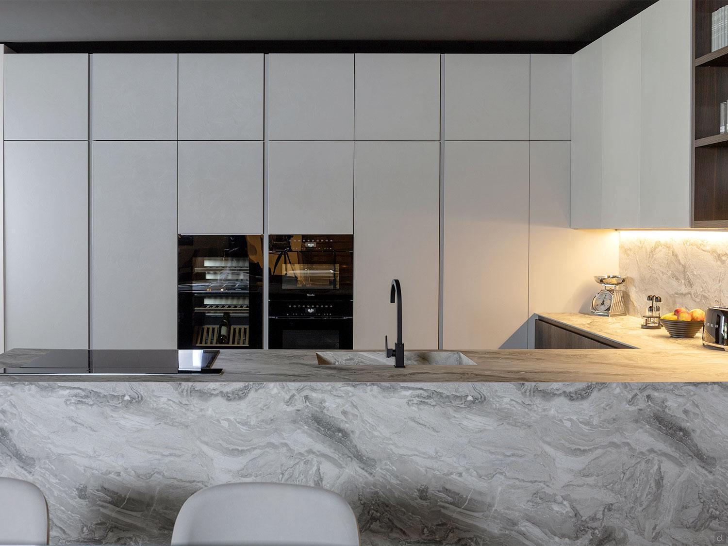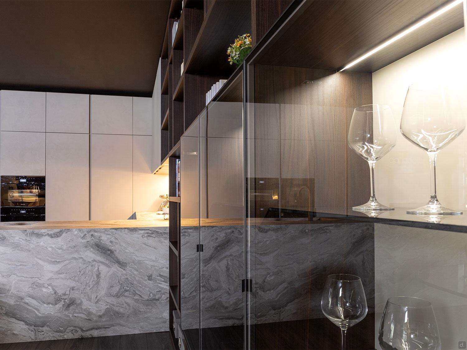 KLab Rift è una cucina a ferro di cavallo con rivestimento effetto marmo realizzata su misura. È completa di basi con ante in legno e colonne effetto cemento con elettrodomestici e cantinetta vini integrati. La composizione si sviluppa su tre lati, due a parete e uno aperto a centro stanza.La prima parete è attrezzata con capienti contenitori a colonna a doppia altezza, dove trovano posto dispensa, forno, microonde e cantina refrigerata. Basi e pensili arredano un secondo lato: qui sarà possibile appoggiarsi per preparare tutto quello che serve per cucinare, ma anche riporre bilance, utensili e robot da cucina. La terza zona è completamente dedicata all'area di cottura con piano a induzione e lavello integrato nel top. Questo ultimo lato è progettato in modo tale da creare una sorta di isola che separa la zona operativa dalla sala da pranzo o dal soggiorno. È la configurazione ideale per open space con cucina a vista, dove funzionalità ed estetica devono essere perfettamente combinate. L'area living è infatti arredata con una libreria su misura che si integra alla perfezione con la cucina. Sono i piccoli dettagli a fare la differenza: ad un occhio attento non sfuggirà la cappa a scomparsa integrata nel piano o il tagliere estraibile incorporato nel lavello. Ogni elemento è altamente personalizzabile per creare uno spazio su misura costruito secondo gusti ed esigenze specifici.