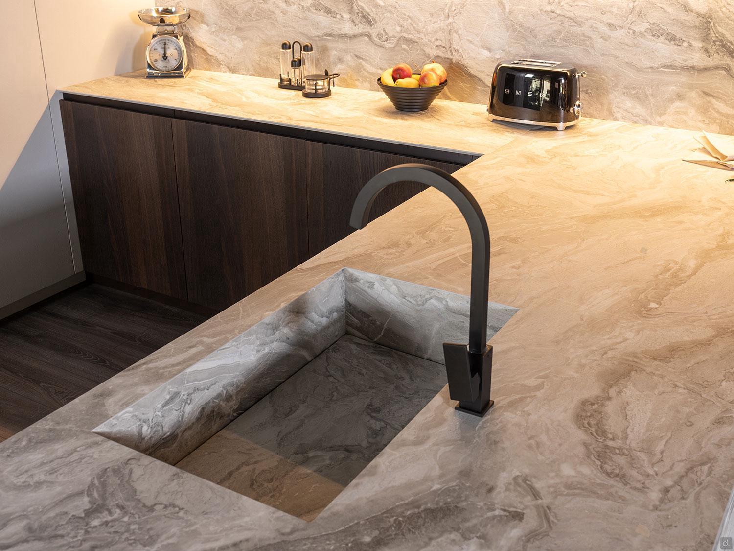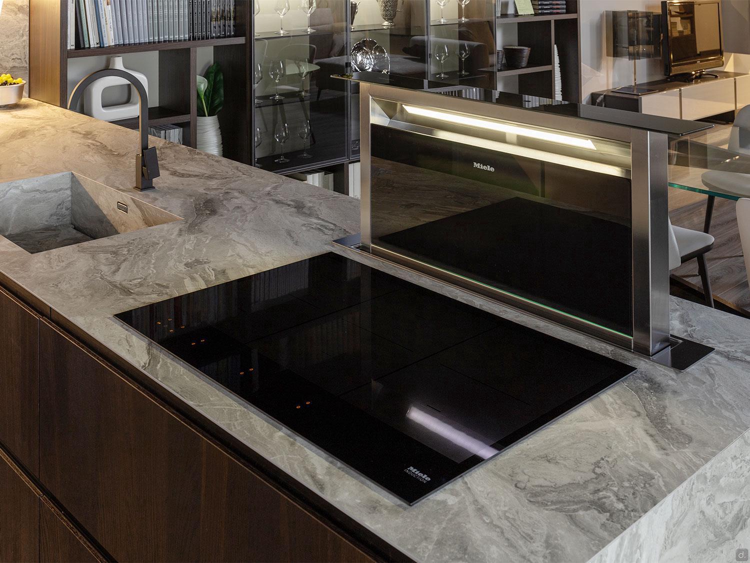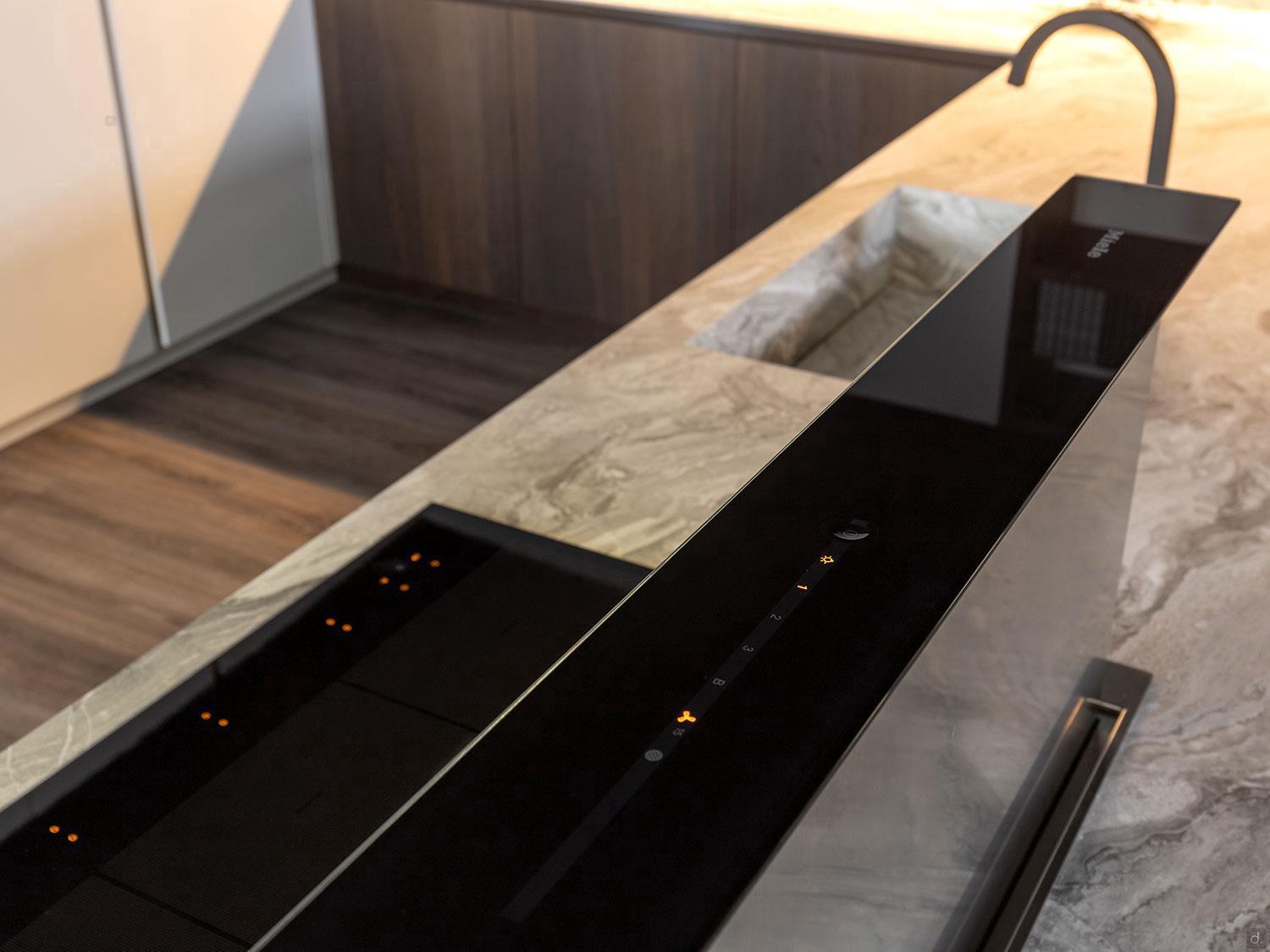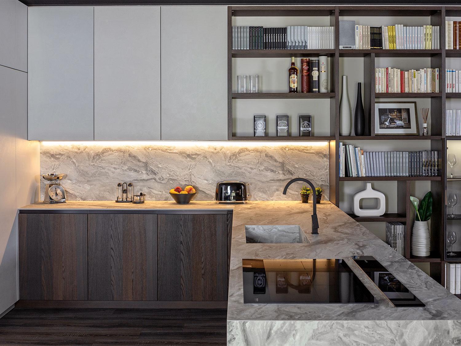 KLab Rift è una cucina a ferro di cavallo con rivestimento effetto marmo realizzata su misura. È completa di basi con ante in legno e colonne effetto cemento con elettrodomestici e cantinetta vini integrati. La composizione si sviluppa su tre lati, due a parete e uno aperto a centro stanza.La prima parete è attrezzata con capienti contenitori a colonna a doppia altezza, dove trovano posto dispensa, forno, microonde e cantina refrigerata. Basi e pensili arredano un secondo lato: qui sarà possibile appoggiarsi per preparare tutto quello che serve per cucinare, ma anche riporre bilance, utensili e robot da cucina. La terza zona è completamente dedicata all'area di cottura con piano a induzione e lavello integrato nel top. Questo ultimo lato è progettato in modo tale da creare una sorta di isola che separa la zona operativa dalla sala da pranzo o dal soggiorno. È la configurazione ideale per open space con cucina a vista, dove funzionalità ed estetica devono essere perfettamente combinate. L'area living è infatti arredata con una libreria su misura che si integra alla perfezione con la cucina. Sono i piccoli dettagli a fare la differenza: ad un occhio attento non sfuggirà la cappa a scomparsa integrata nel piano o il tagliere estraibile incorporato nel lavello. Ogni elemento è altamente personalizzabile per creare uno spazio su misura costruito secondo gusti ed esigenze specifici.