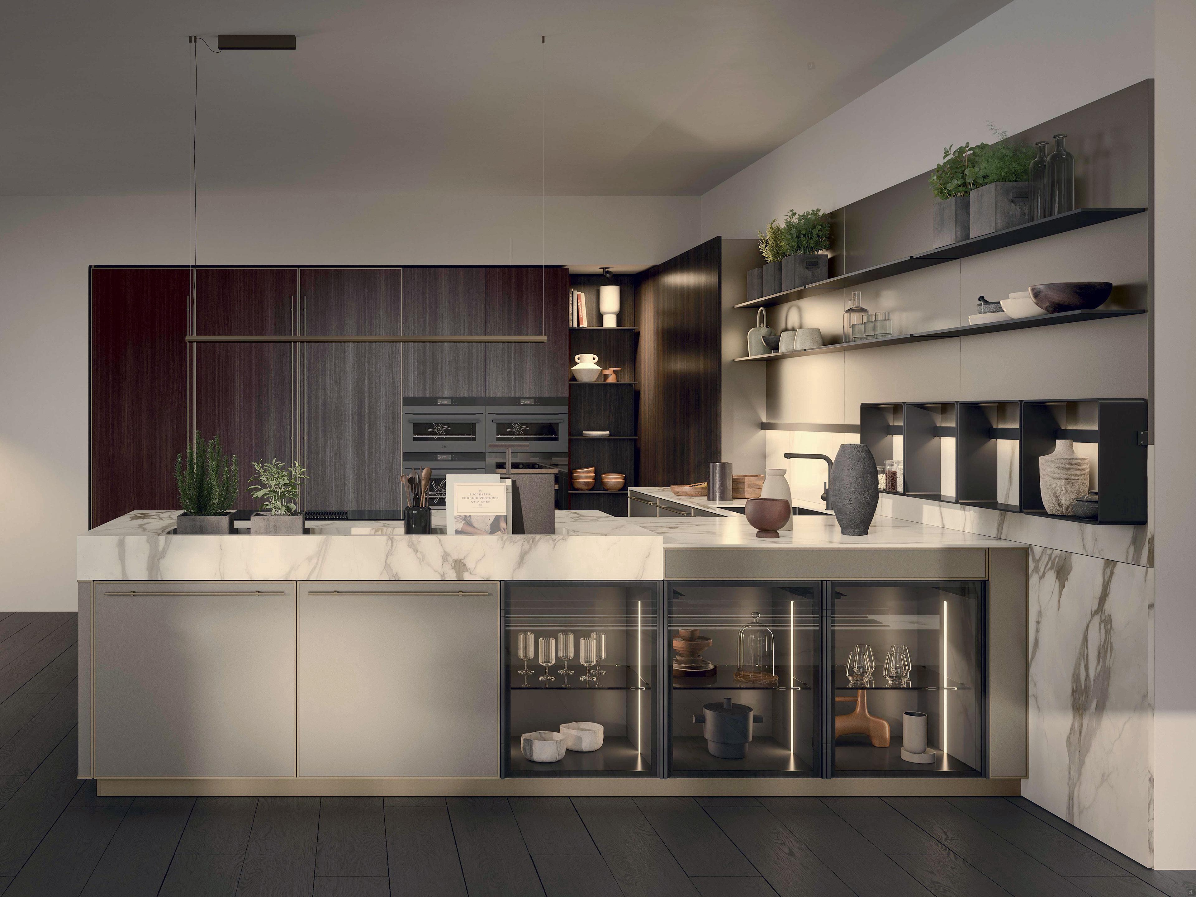 Caratteristichecucina angolare di grandi dimensioni piano in Calacatta a doppio spessoremensole configurabili con schienale metalizzatotriplo forno e cantinetta vini integrata