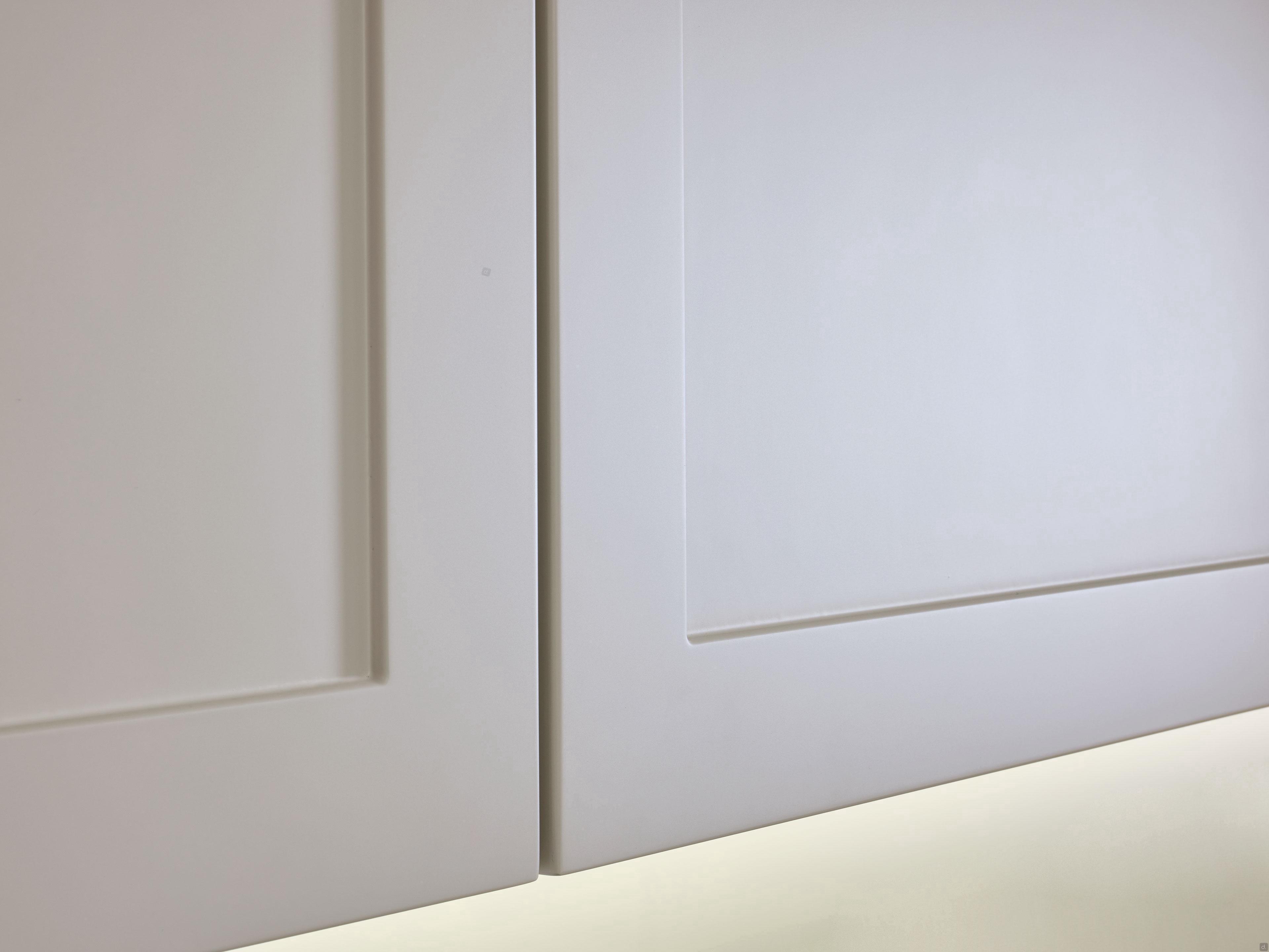 Altro elemento caratterizzante della cucina Eleven sono i pensili con anta a telaio rivisitata in chiave moderna. La tradizione incontra la modernità in questa cucina pensata per chi ama le ante a telaio, ovvero riquadrate da una cornice più spessa, ma al tempo stesso cerca una soluzione moderna, che strizzi l'occhio al design minimal e contemporaneo.