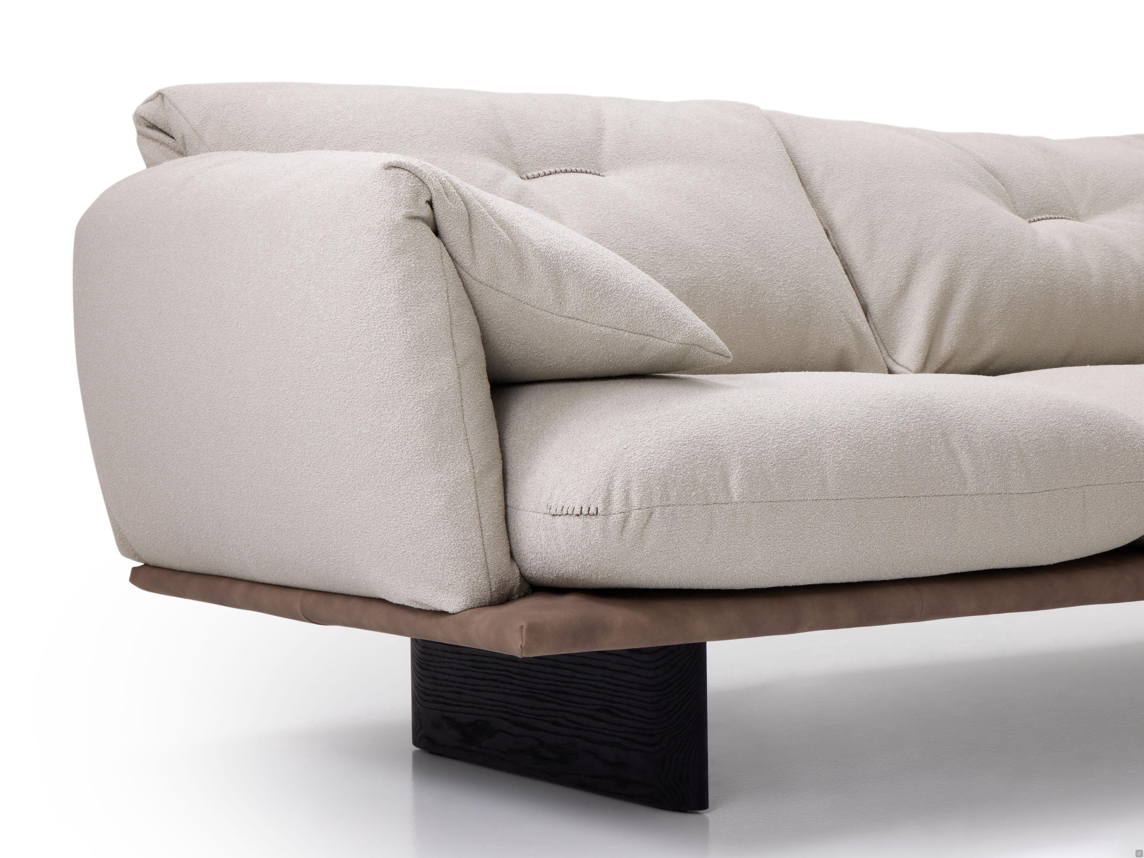 Caratteristicherivestimento bicolore in tessuto e similpelle imbottitura delle cuscinature in piuma canalizzatain appoggio su piedini in legno sagomatoricamo centrale sul cuscino di schienale con fili a contrasto, per un effetto di "movimento"elementi minuziosamente rifiniti con dettagli e cura sartoriale, perfettamente sfruttabili anche a centro stanza