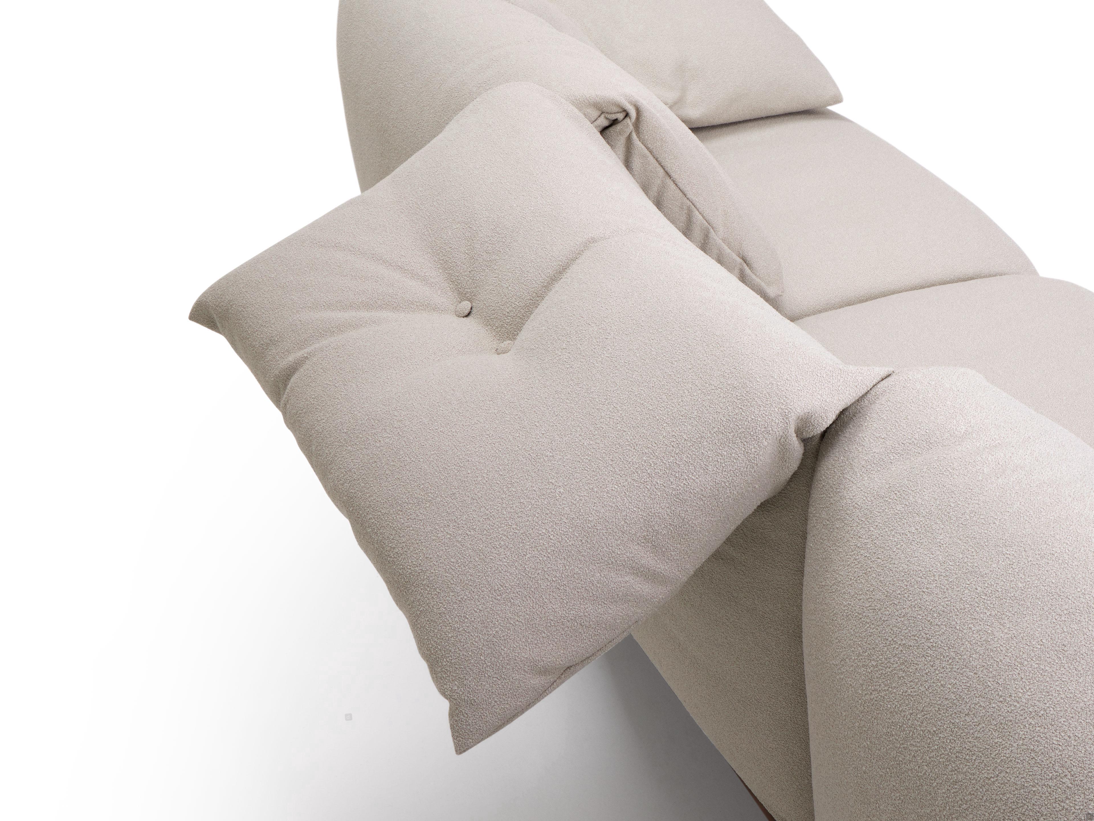 Norman outlet è un divano lineare sostenuto da piedini in legno sagomati. Proposto in versione bicolore, presenta morbide e avvolgenti cuscinature rivestite in tessuto mini-bouclè, idrorepellente e antimacchia, nella raffinata tonalità tortora chiaro. Il rivestimento crea un elegante contrasto con il pianale sottostante, rifinito in similpelle liscia opaca color testa di moro. Un ricamo centrale, caratterizzato da una leggera tiratura del rivestimento, impreziosisce i cuscini di schienale. Questo delicato e discreto dettaglio conferisce all'insieme un gradevole e discreto senso di movimento. Norman outlet è il risulato di una perfetta fusione tra comfort e stile, sviluppato seguendo le regole della grande tradizione artigianale del made in Tuscany.