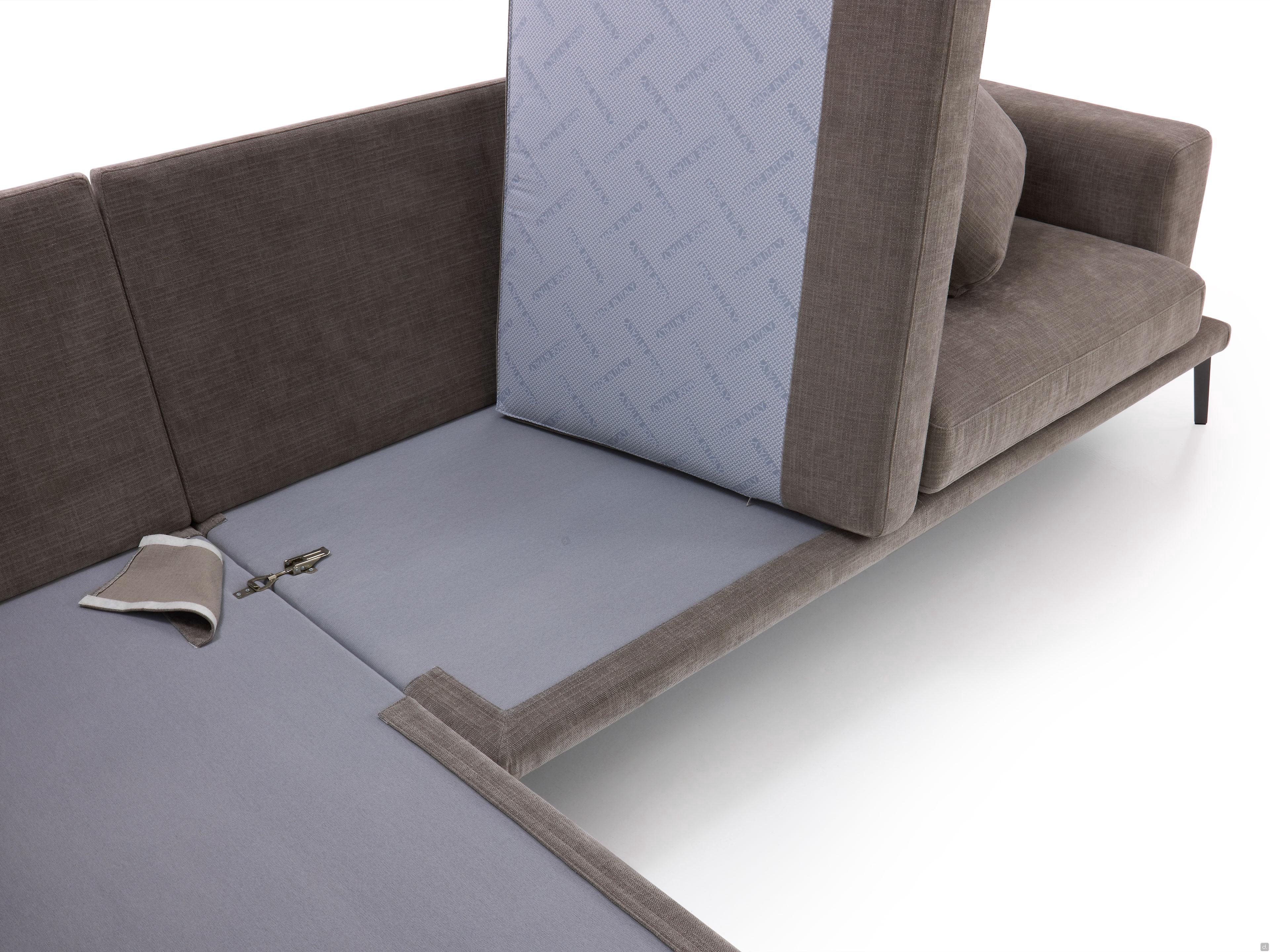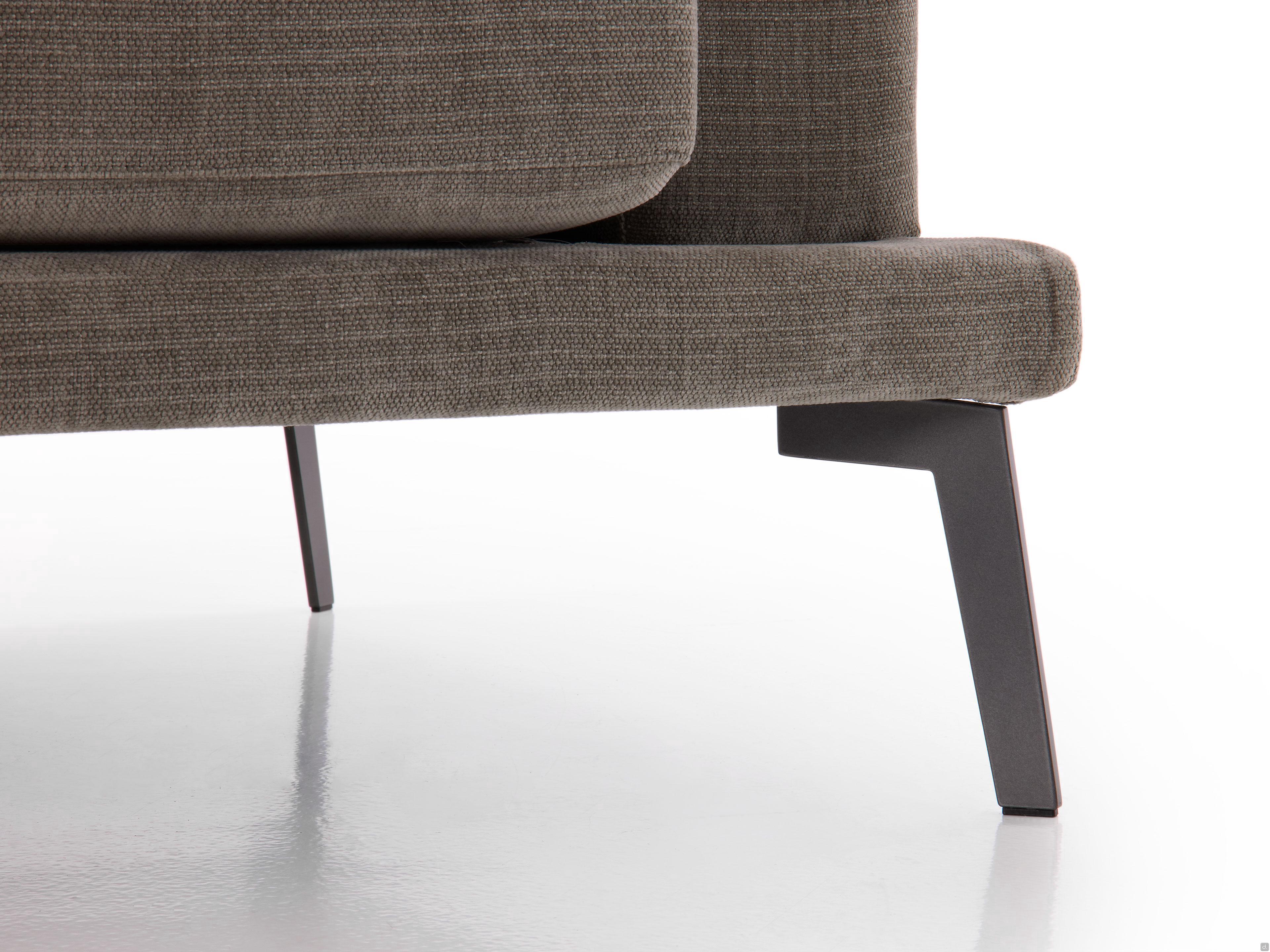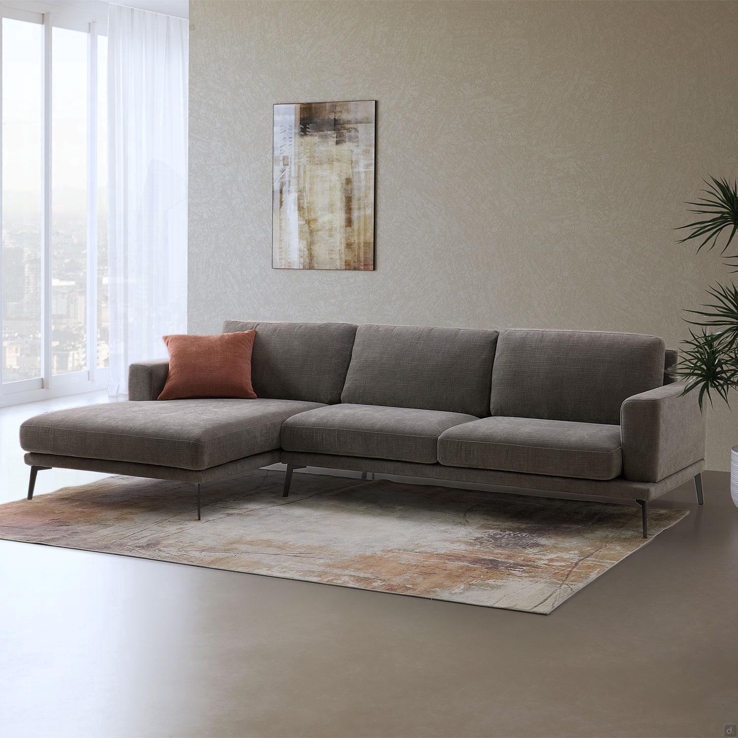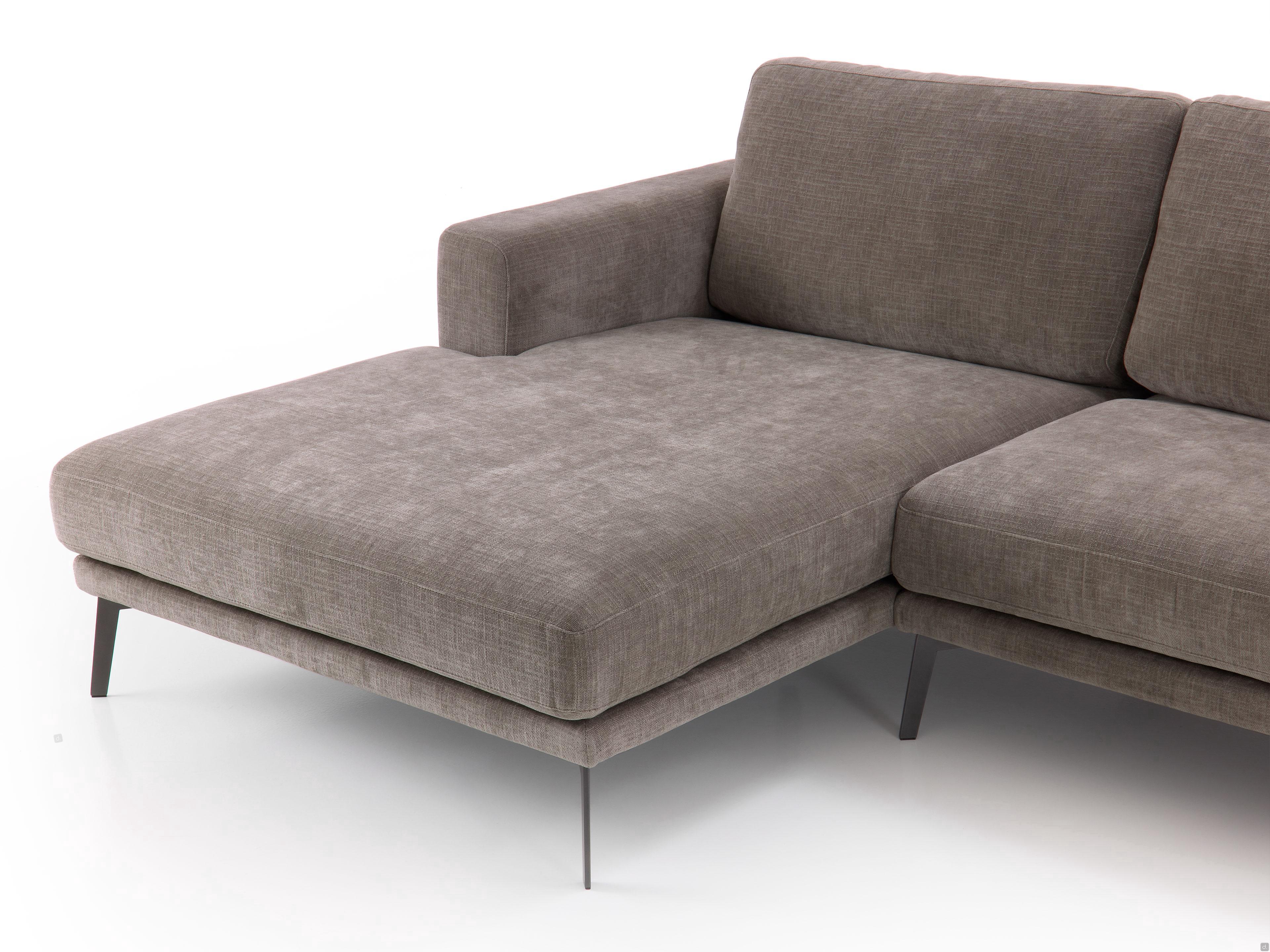 Caratteristiche divano con chaise longue dalle forme semplici e rigorose rivestimento totalmente sfoderabile in tessuto piedini alti in metallo verniciato antracite per un piacevole "effetto sospeso" collocabile a parete ma anche a centro stanza