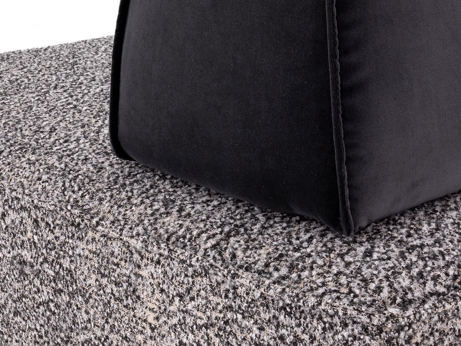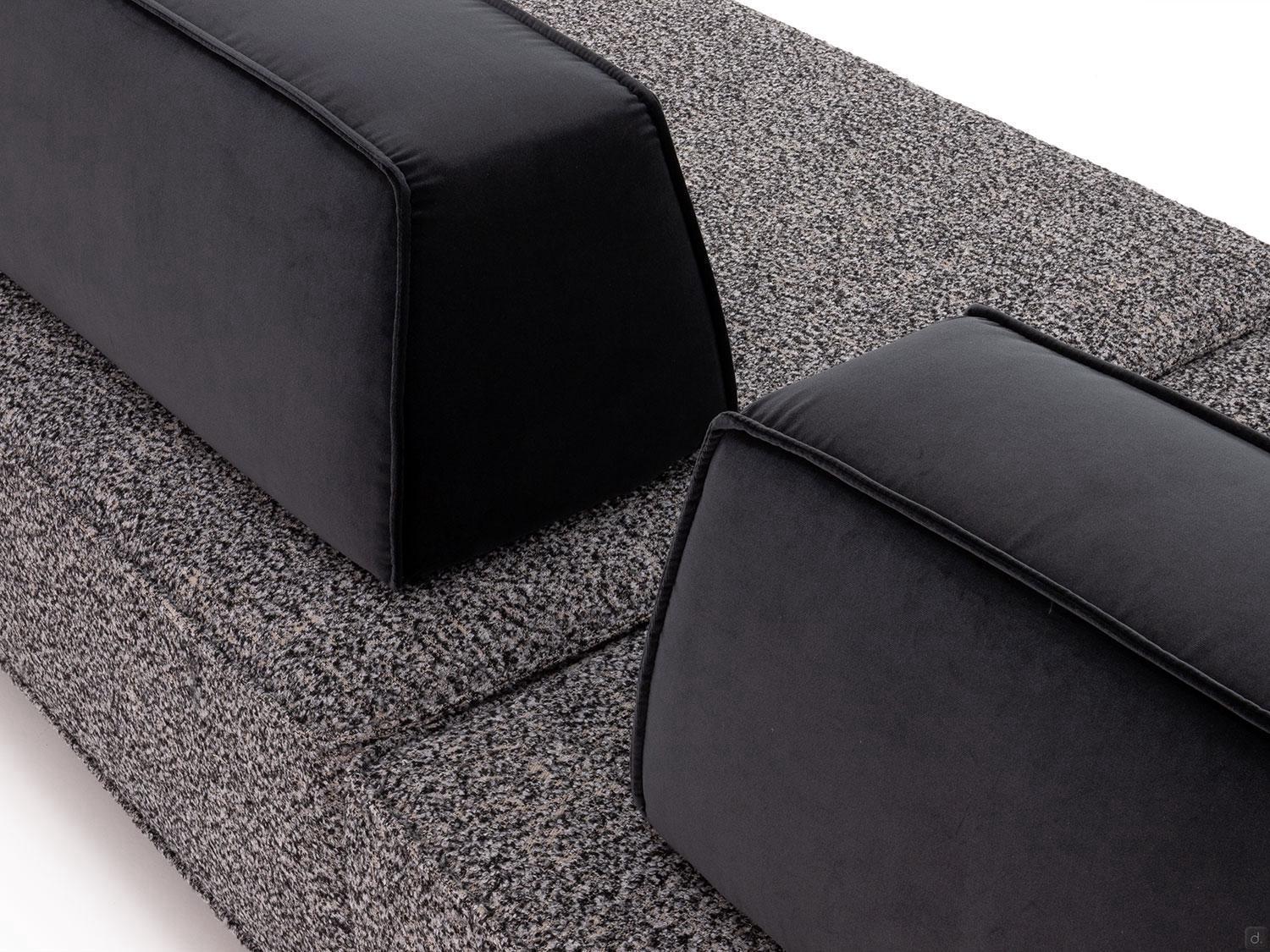 Il divano Prisma outlet con schienali spostabili è formato da due elementi distinti accostati tra loro che danno vita ad una soluzione angolare dal design giovane e moderno. La possibilità poi di posizionare ovunque e liberamente gli schienali garantisce la massima personalizzazione del sistema di sedute e offre quindi diversi vantaggi: dalla totale assenza di un verso destro o sinistro predefinito, alla possibilità di regolare autonomamente la profondità e lo stile di seduta in base alla propria ergonomia e comodità, alla possibilità di una doppia seduta sia rivolta verso la tv che verso la zona pranzo.I tre schienali, due lineari ed uno angolare, a forma di trapezio sono zavorrati e antiscivolo, in modo da sostenere il corpo quando si è seduti, e fungono anche da bracciolo.Prisma outlet è proposto con rivetimento bicolore: i cuscini di schienale sono realizzati in velluto mentre un tessuto bouclè caratterizza le sedute: la lavorazione sartoriale prevede una rifinitura con cucitura a nervetto pizzicato.