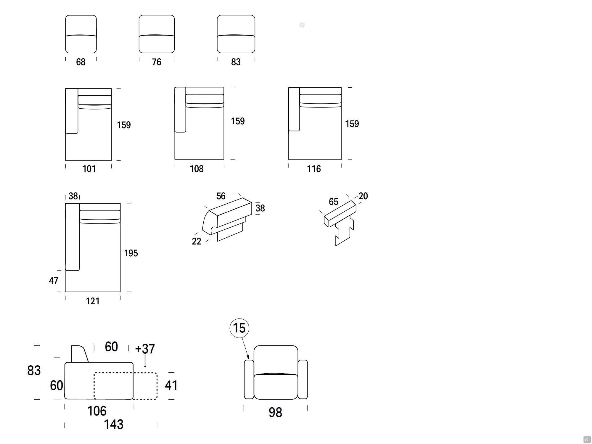 Modello e DimensioniVisualizza elementi e dimensioni disponibili nel ConfiguratoreLarghezza: - bracciolo: cm 25 (solo per poltrona: cm 15)Profondità:- totale: cm 106 (cm 143 con seduta estratta)- seduta: cm 60 (cm 97 con seduta estratta)- chaise longue: cm 159- dormeuse: cm 195Altezza:- schienale: cm 83- seduta: cm 41- bracciolo: cm 60