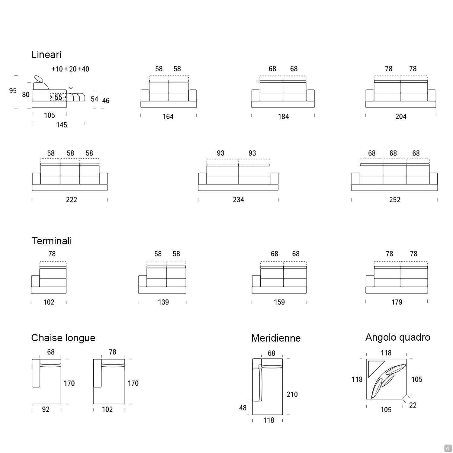 Modelli e DimensioniModelli- lineare, con chaise longue, angolare, angolare meridienneLarghezza- bracciolo: cm 24Profondità- totale: cm 105 (con seduta estraibile: cm 115 - 125 - 145)- seduta (a divano chiuso): cm 55Altezza- schienale e poggiatesta: da cm 81 a cm 95- bracciolo: cm 55- seduta da terra: cm 43Materiali e Finiture- tessuto, velluto, similpelle (sfoderabili)