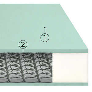 Molleggio (2): 400 molle biconiche (stima del numero di molle per materasso matrimoniale) in acciaio fosfatato assemblate secondo il sistema Bonnel. Il molleggio sollecitato dal peso del corpo risponde per ampie zone di appoggio e non per punti singoli di pressione.