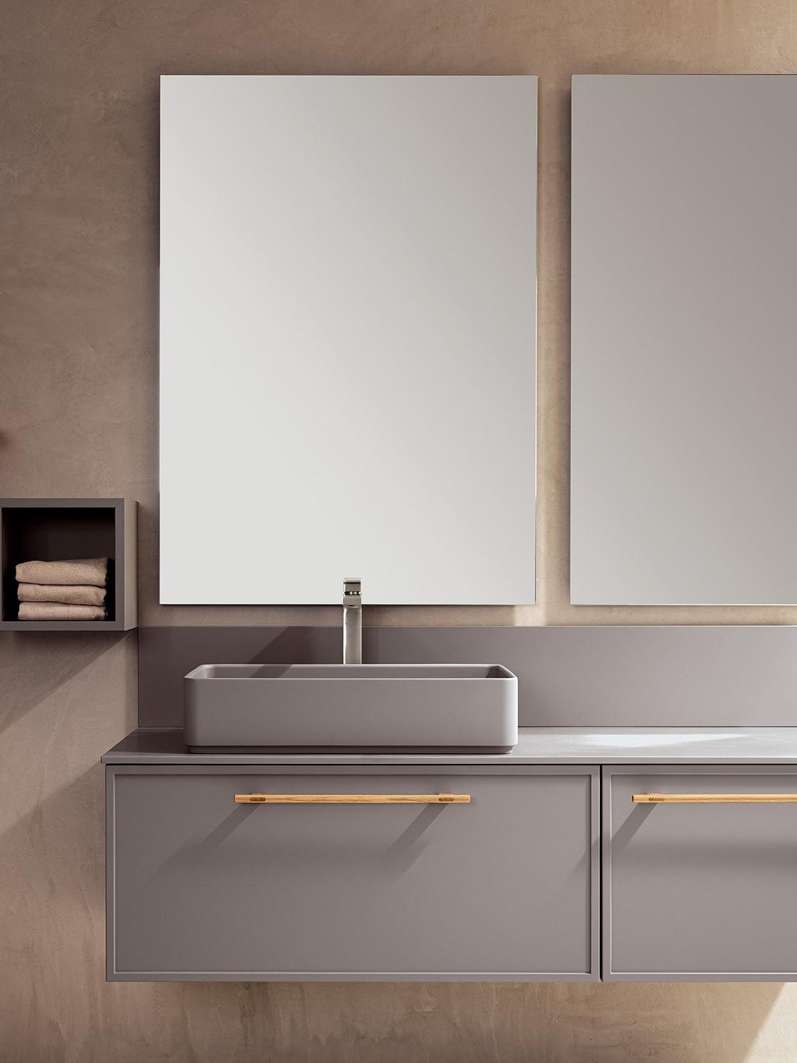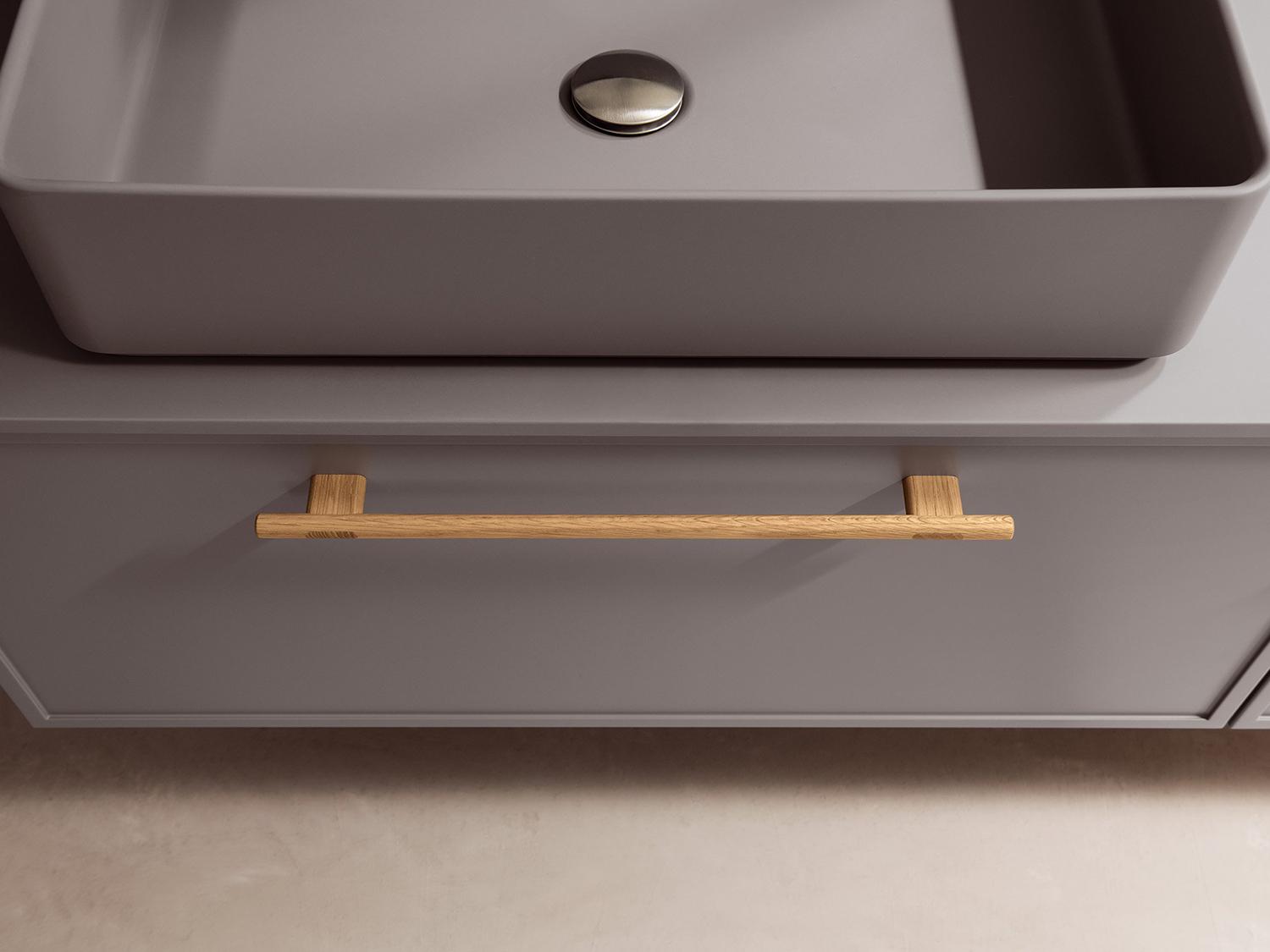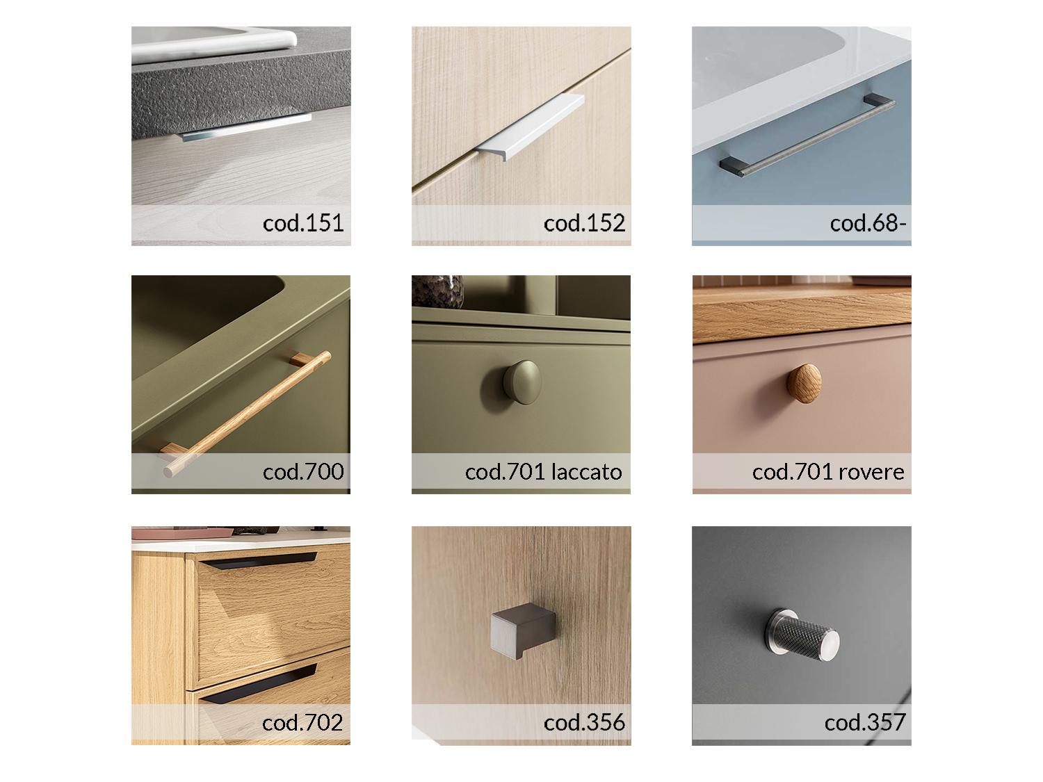 Aumenta il grado di personalizzazione del mobile bagno la scelta tra diversi modelli di maniglie, in metallo cromato o laccato oppure in rovere naturale, per un aspetto con richiami a un design essenziale, naturale e dal gusto scandinavo. Top e lavabo, smaltati e laccati in tinta alle basi per creare un armonioso e al tempo stesso accattivante effetto monocromatico, sono in Minera-Kolor, un materiale che unisce elementi minerali naturali a resina poliestere per offrire e una resa estetica di alto livello.