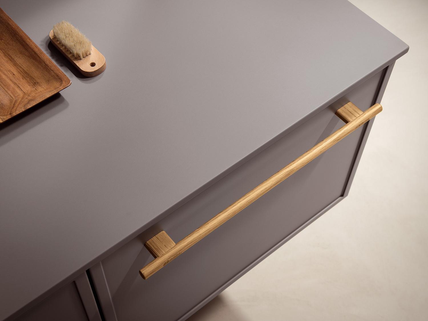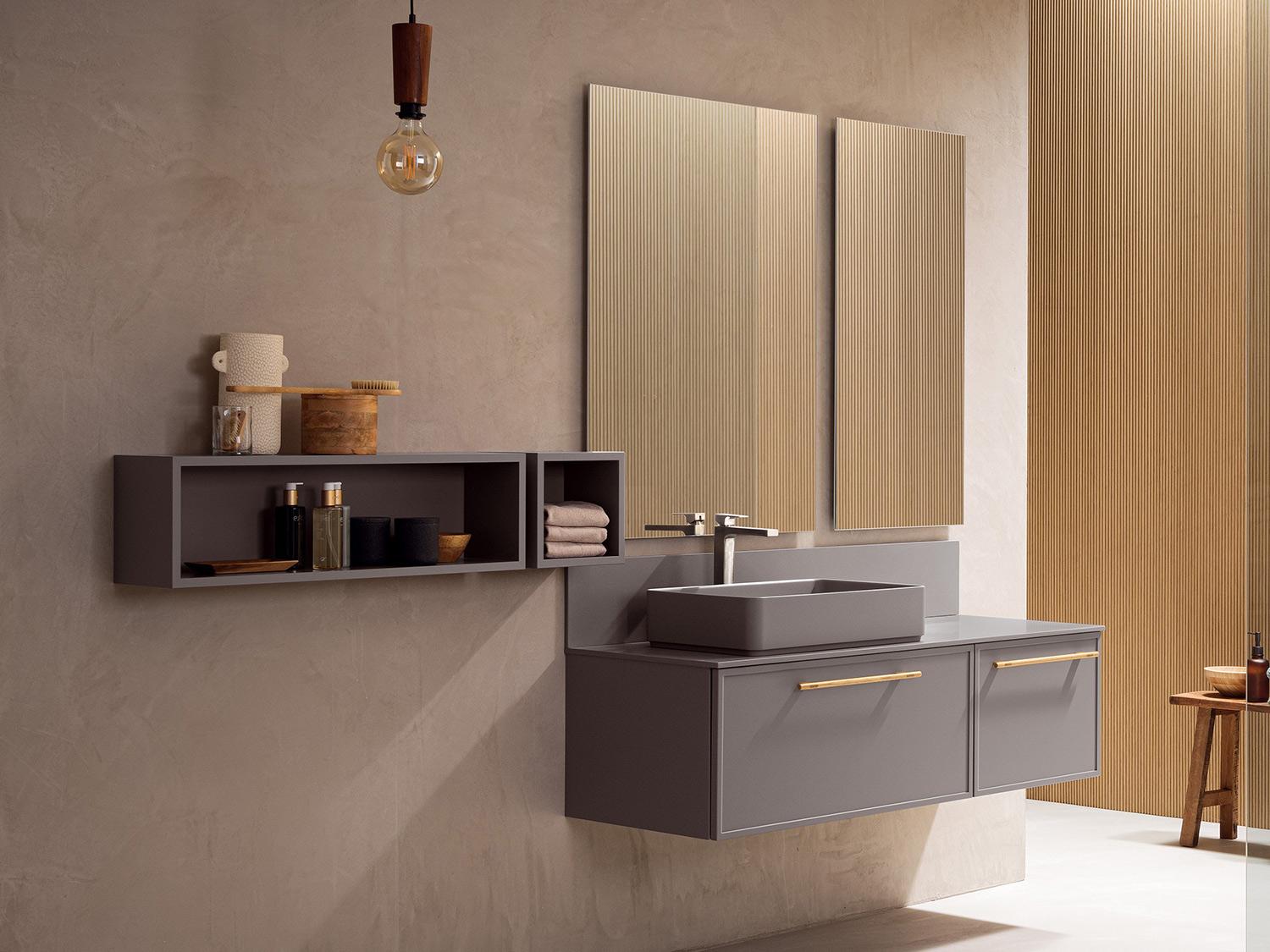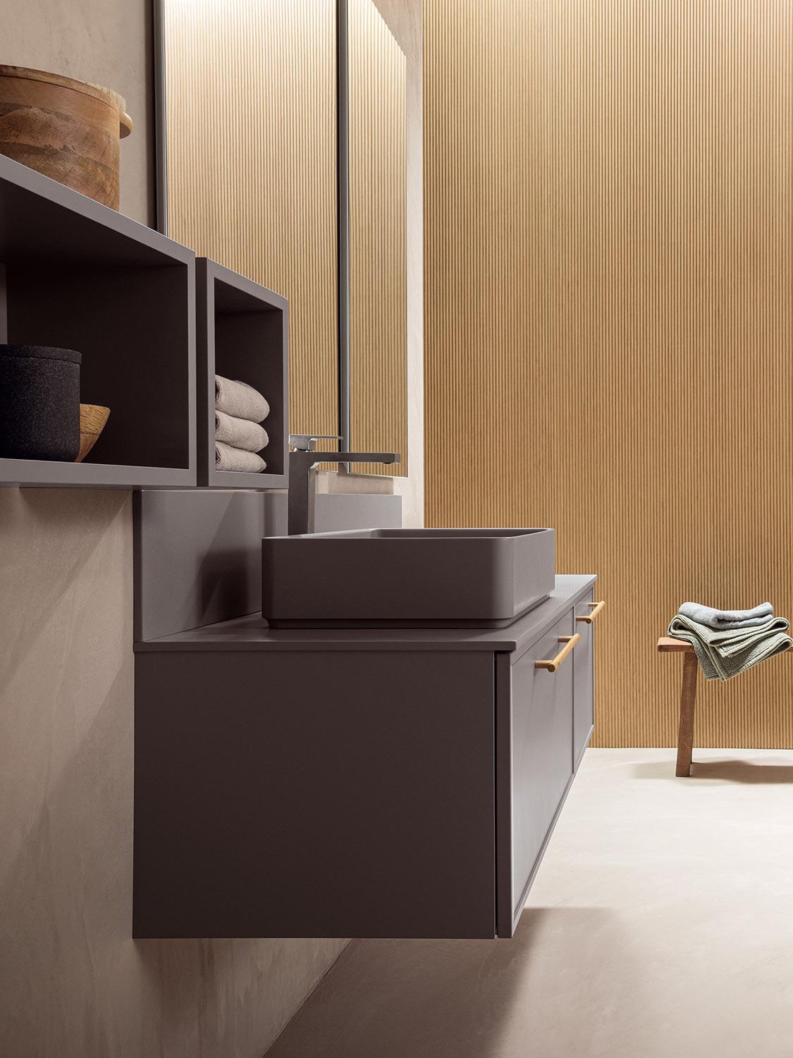 Aumenta il grado di personalizzazione del mobile bagno la scelta tra diversi modelli di maniglie, in metallo cromato o laccato oppure in rovere naturale, per un aspetto con richiami a un design essenziale, naturale e dal gusto scandinavo. Top e lavabo, smaltati e laccati in tinta alle basi per creare un armonioso e al tempo stesso accattivante effetto monocromatico, sono in Minera-Kolor, un materiale che unisce elementi minerali naturali a resina poliestere per offrire e una resa estetica di alto livello.