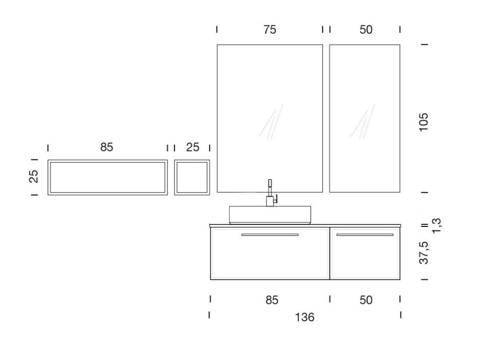 Il top in Minera-Kolor sporge frontalmente di 1 cm e lateralmente di 0,5 cm per lato: la profondità della sola base è inferiore di 1 cm rispetto al top. L'altezza complessiva del mobile bagno è pari alla somma dell'altezza della base, dello spessore del top e di quello del lavabo.