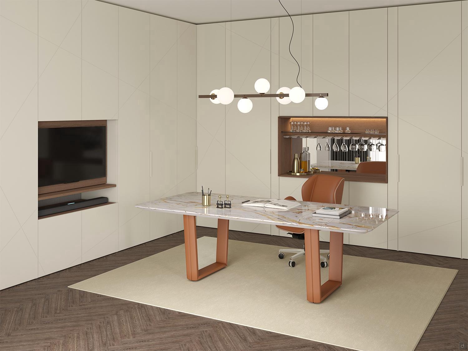 Ante / Cassetti: in tamburato cm sp.2,4 con telaio in massello di abete, laccate o in legno. I frontali possono essere lisci o personalizzati (esclusivamente in finitura laccato opaco o legno rovere poro aperto):