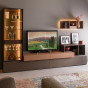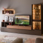 Sulla parte destra l'attenzione viene catturata dalla grande vetrina con ripiani in vetro, impreziosita dal cassetto contenitore in tinta agli interni. Sulla parte sinistra, invece, lo spazio contenitivo è offerto dagli ampi vani a giorno, perfetti per ospitare libri e piccola oggettistica. La grande vetrina e il pensile a giorno sospeso, incorniciano delicatamente l'intera composizione, enfatizzando il grande effetto scenografico grazie all'illuminazione LED.
