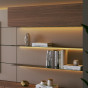 Barre LED sotto-mensola: da 11,6 W ciascuna, complete di alimentatore da 75 W con protezione sovraccarico. Fissaggio magnetico alla mensola, con copertura frontale in tinta alla mensola da 1,2 cm e luce led incassata da 3000K. I pannelli boiserie, così come il retro-pannello in MDF, prevedono di serie una scanalatura per il passaggio dei cavi di alimentazione, che escono sempre da destra (guardando frontalmente la mensola).