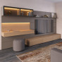 Struttura e Frontali dei Contenitori: realizzate in pannelli di particelle di legno con spessore cm 2. Rivestite con nobilitazione sintetica anche laccata opaca, lucida, metallizzata o con piallaccio di legno verniciato. La struttura lucida è da intendersi estesa solo all'esterno dei fianchi e ai relativi bordi perimetrali. Interno e schienali sono forniti con il corrispondente colore laccato opaco. Per gli elementi con cassetto l'interno è sempre Sketch Roccia. Il frontale del pensile vetrina è realizzato con telaio strutturale in alluminio, laccato opaco, metallizzato oppure epossidico. Il vetro è temperato, cm sp.0,4.