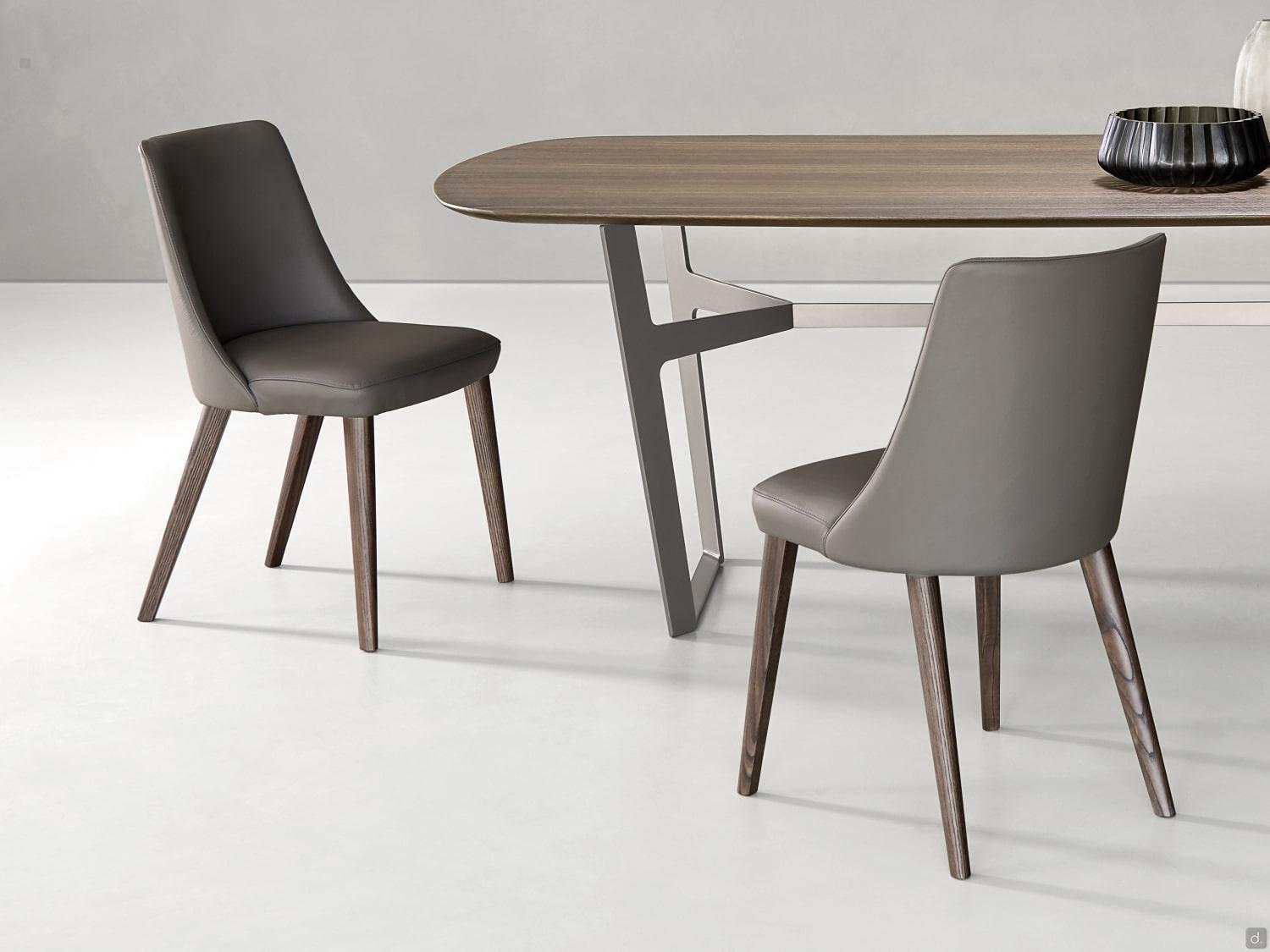 Laura è una sedia in pelle e legno imbottita, disponibile nei modelli con e senza braccioli, con seduta e schienale anche in similpelle e tessuto in numerosissime colorazioni. Il tratto caratteristico di Laura è il design avvolgente in entrambi i modelli. Lo schienale è leggermente curvato e inclinato, la seduta è ampia e accogliente. L'imbottitura in poliuretano espanso con prefodera in ovatta di poliestere donano una piacevole sensazione al tatto. La struttura è proposta in massello di frassino tinto rovere o tinto noce; l'ampia possibilità di scelta per struttura, seduta e schienale rende Laura combinabile con numerosi tavoli in finiture o colori coordinati per creare una piacevole continuità compositiva.
