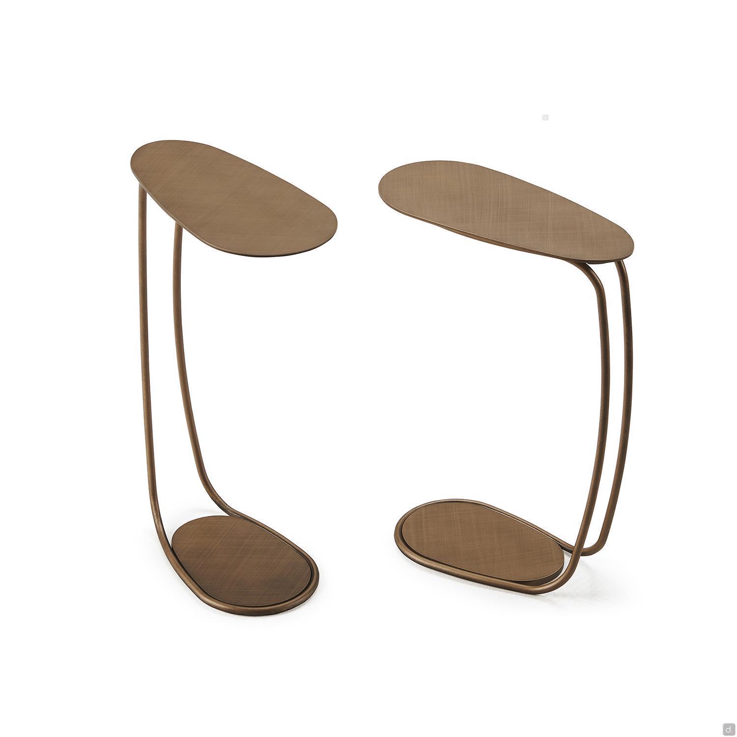 Yago di Cattelan è un tavolino servente di design contraddistinto dalla particolare forma a "C" che gli permette di accostarsi al divano ed essere utilizzato come comodo piano d'appoggio per tazze e bicchieri. Il design minimale lo rende sinuoso e leggero alla vista, rifinito con un tocco raffinato dalla finitura in acciaio goffrato. L'impatto visivo è sobrio ed essenziale, perfetto sia singolo che come coppia di complementi, lato o fronte divano. Le due altezze disponibili, differenti per pochi centimetri, permettono un abbinamento geometrico leggero e gradevole alla vista.
