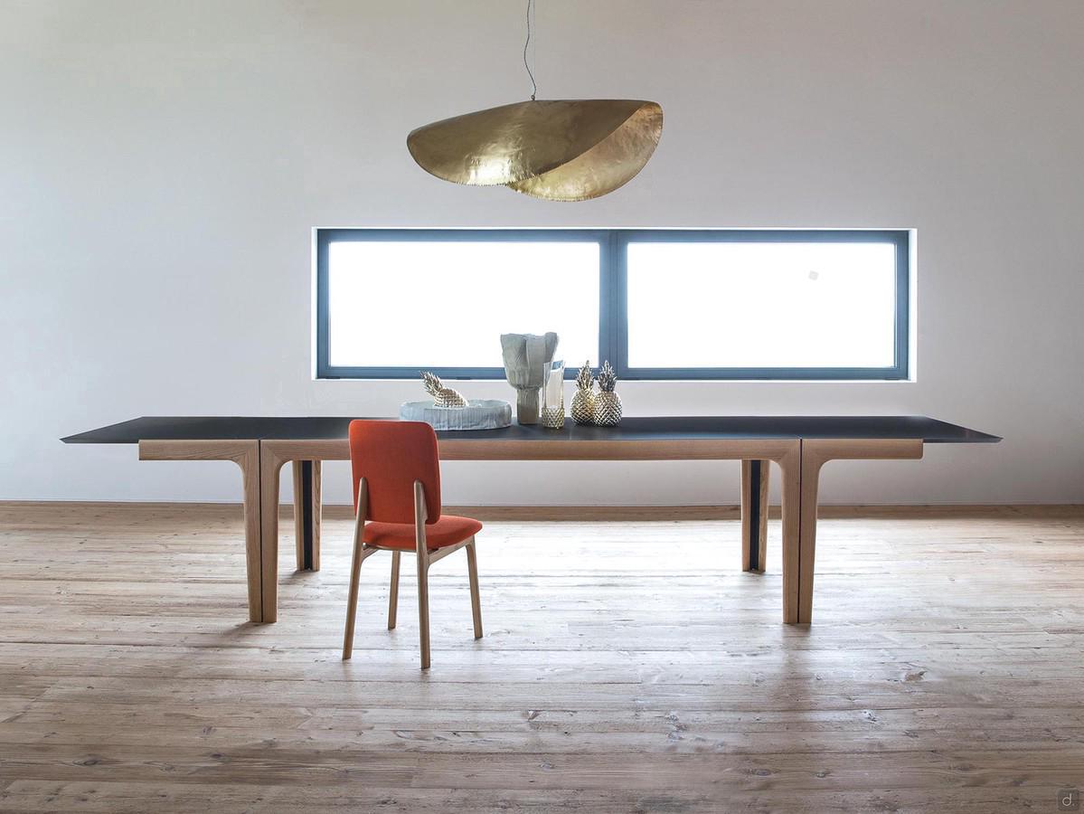 Gualtiero è un tavolo allungabile da 14 posti il cui focus è la grande variazione dimensionale, resa possibile tramite un meccanismo di estensione raffinato ed originale. Proposto nelle larghezze minime di cm 180 o 220 allungabili rispettivamente fino a cm 320 e 386 può ospitare comodamente fino a 14 commensali. L'attenzione viene subito catturata dal piano in Fenix e dalla solida struttura in legno massello uniforme, pulita ed essenziale, enfatizzata lungo tutta la silhouette dal taglio a 45°, disponibile nelle finiture frassino o noce canaletto. La struttura crea una cornice minimale che nasconde al suo interno le due allunghe, mantenendo inalterato il design del tavolo. Tramite un semplice gesto, le gambe caratterizzate da chiuse, da una sezione a "cuore", si aprono a libro, posizionandosi successivamente in modo complanare ai lati lunghi, diventando la loro naturale prosecuzione.