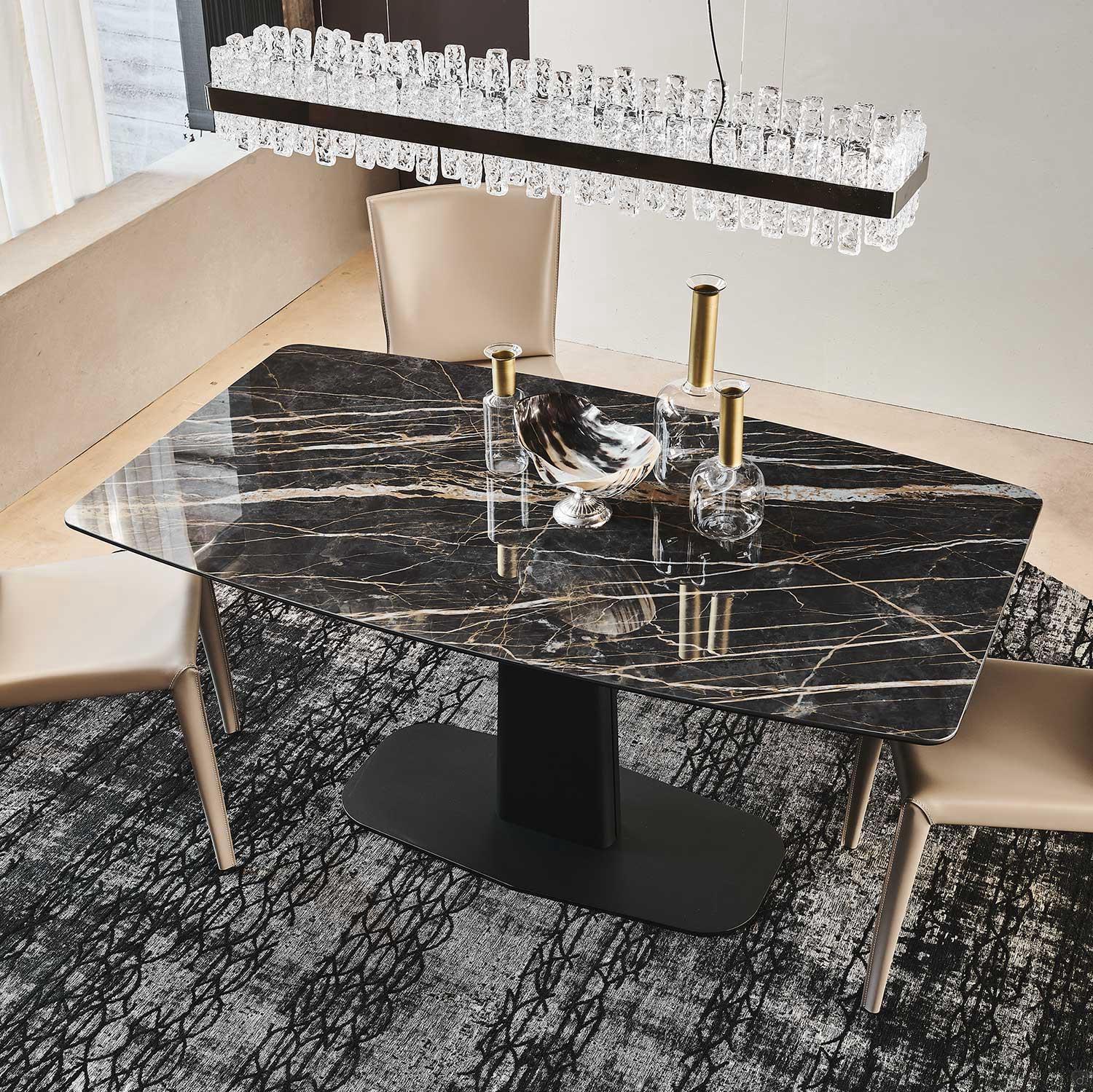 Linus di Cattelan è un tavolo allungabile con piede centrale contraddistinto dal piano sagomato in diverse finiture pietra Keramik effetto marmo. La struttura centrale è costituita da una colonna in acciaio verniciato goffrato titanio, graphite e nero con base in tinta oppure cromo nero con base a terra in metallo goffrato nero.Piano ed allunghe sagomate presentano una preziosa continuità di texture della pietra ceramica effetto marmo, moderne finiture che rendono Linus un tavolo di elevata eleganza ed attualità ideale in sale da pranzo contemporanee ed al tempo stesso ricercate.