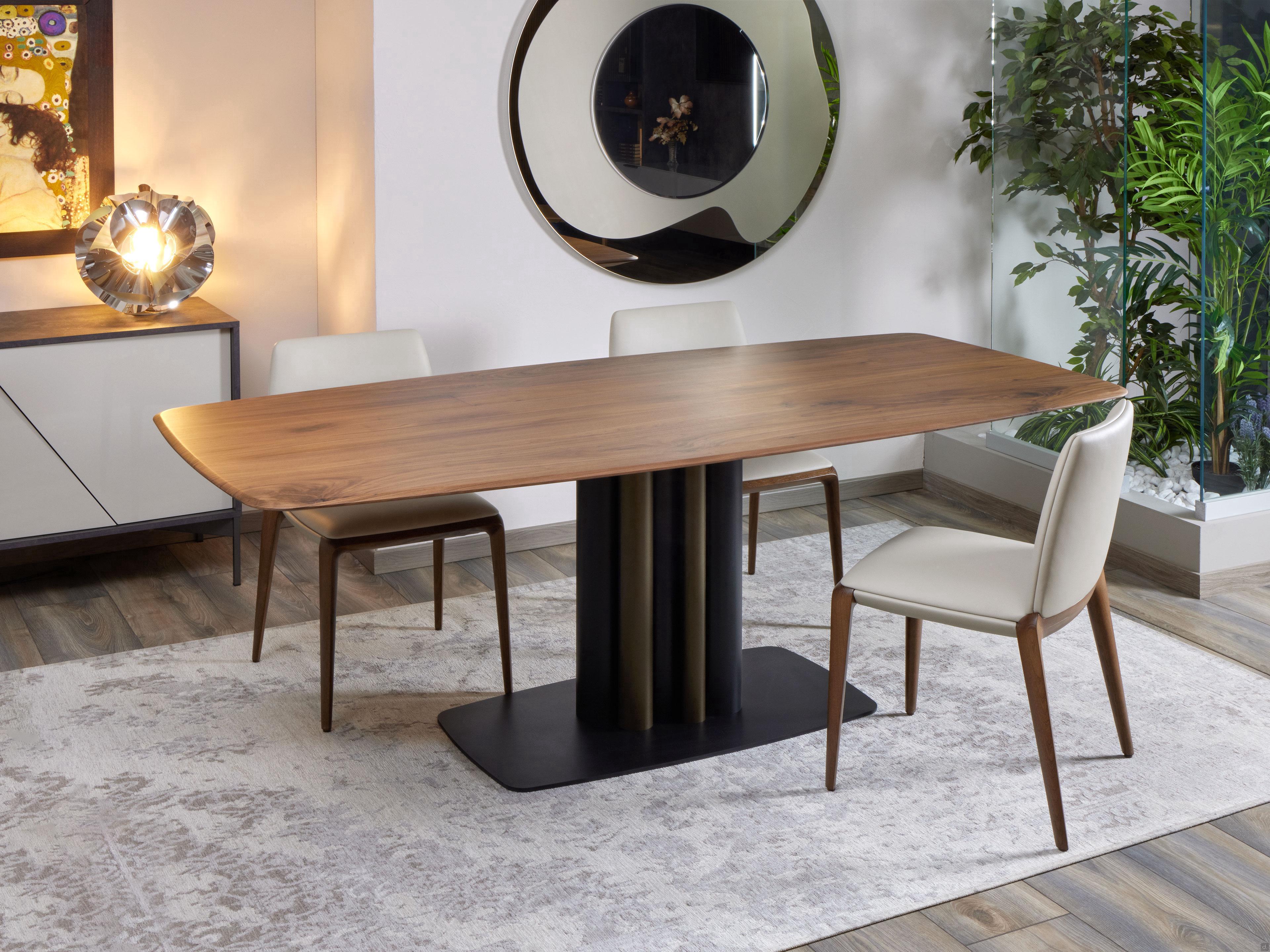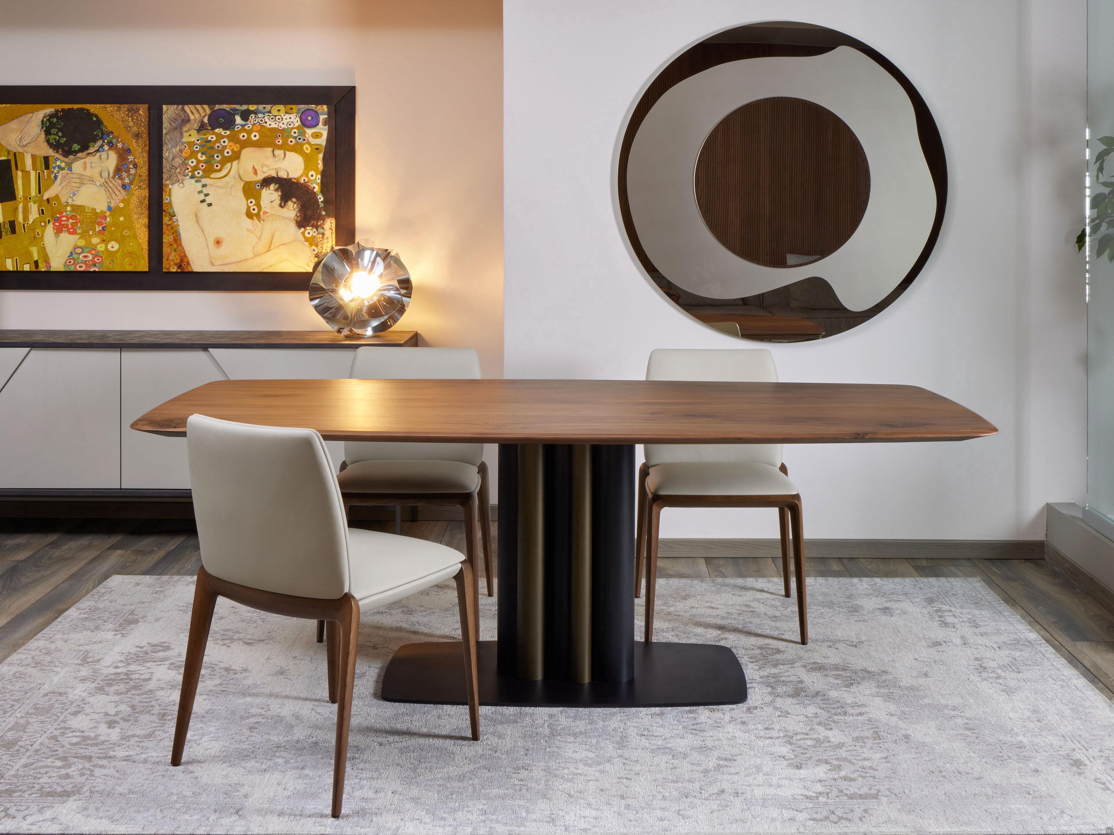 Sistema di Allunga Wing: consente di estendere la superficie dei tavoli mediante l'impiego di due allunghe da 40 cm ciascuna. L'estrazione delle allunghe è faciliata dallo scorrimento delle stesse su guide, così che attraverso un semplice gesto queste possano essere innestate o ripiegate sotto il piano.
